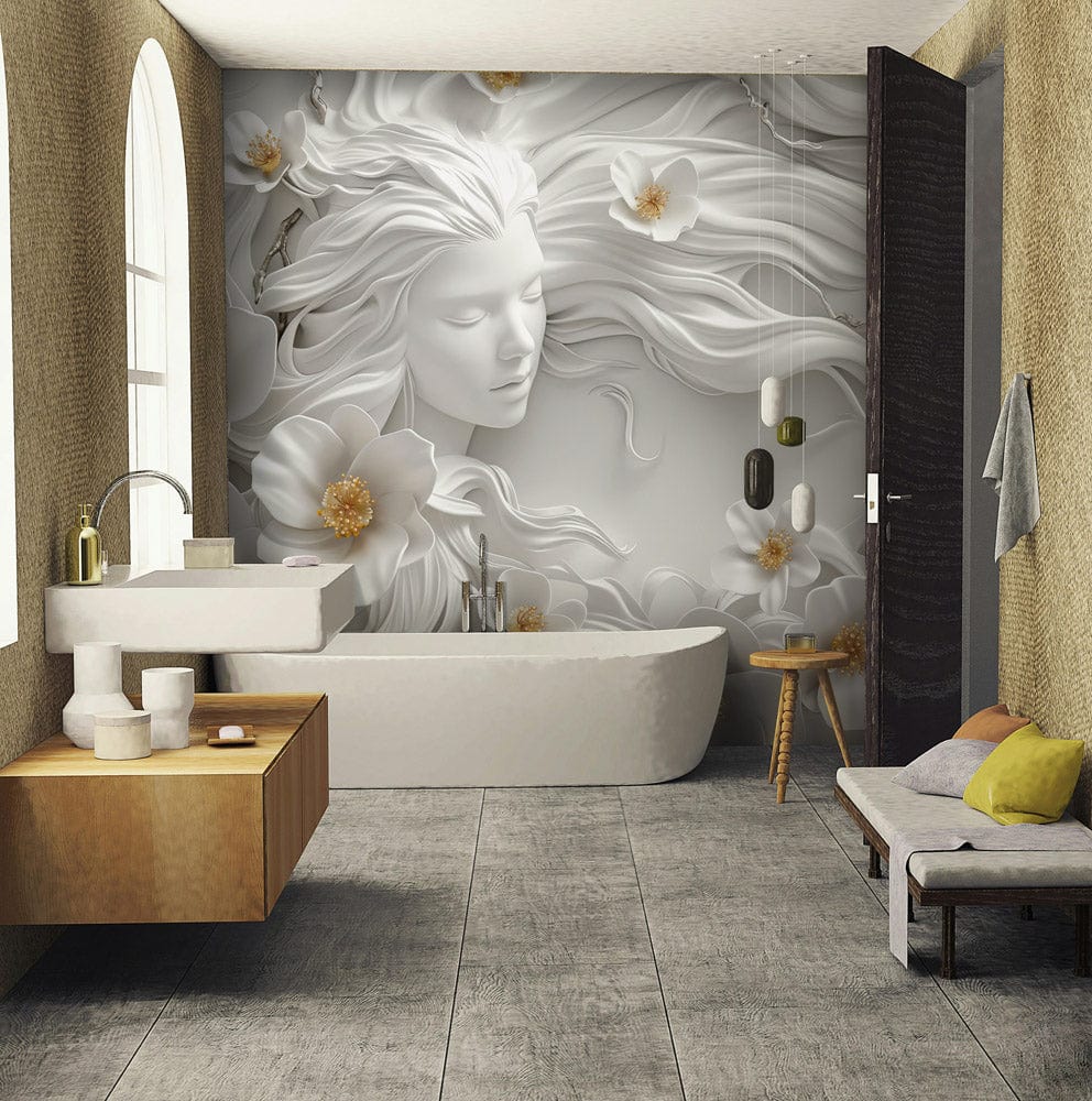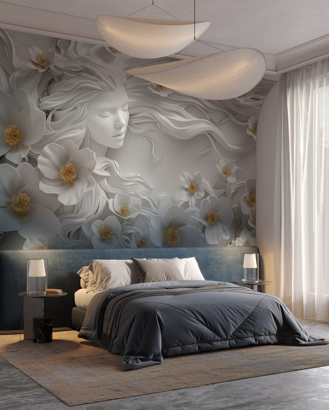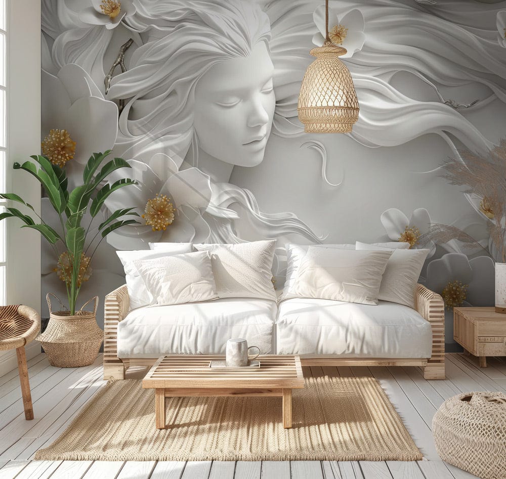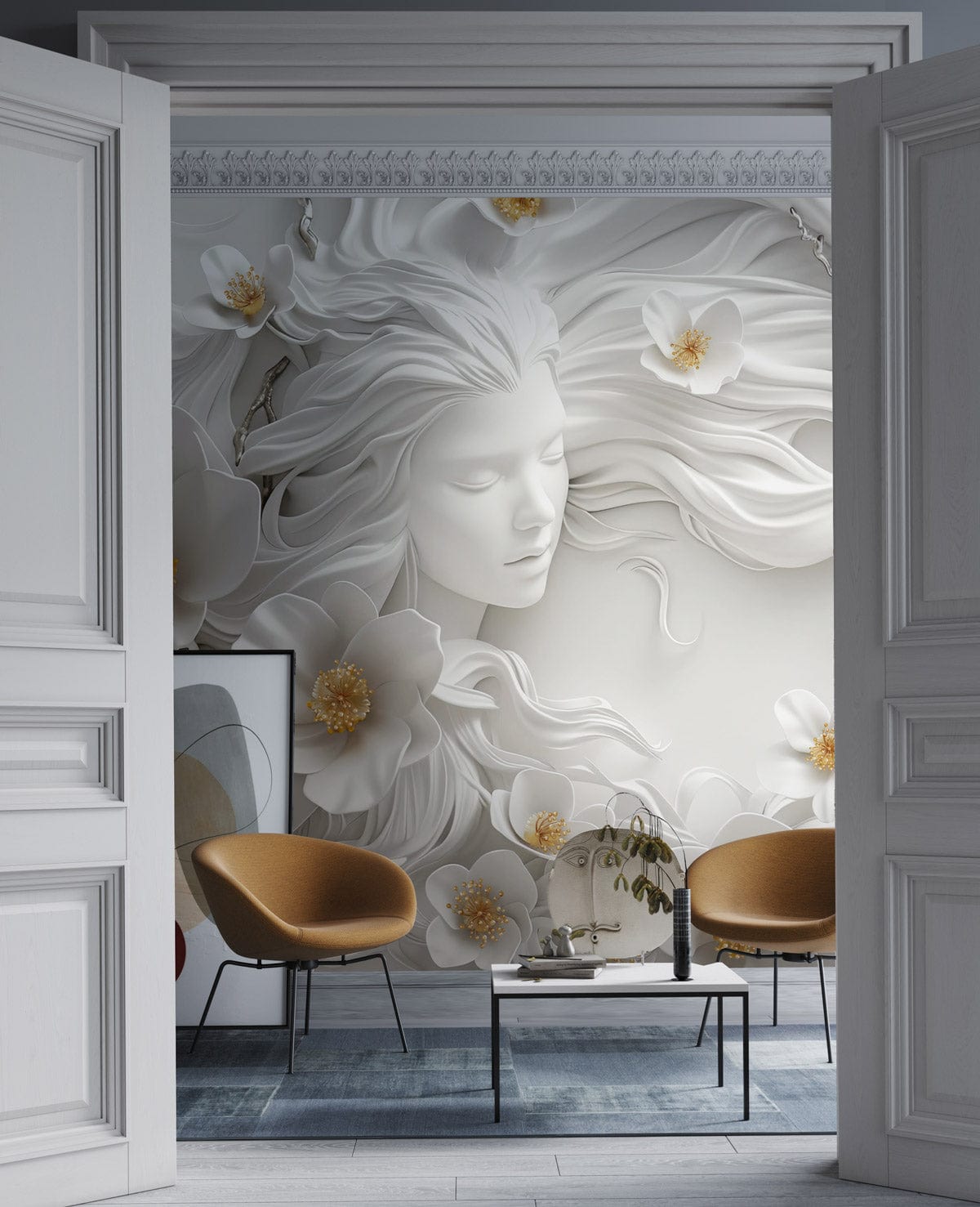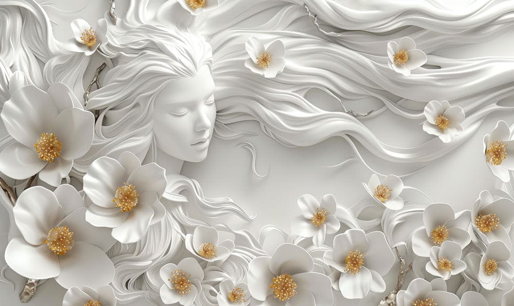 Immerse your senses in the exquisite elegance of the Ethereal Serenity Blossom Mural Wallpaper, where delicate white flowers with intricate golden centres gracefully intertwine with flowing silken hair. This artful design invites a sense of tranquil sophistication, seamlessly fitting into an array of interior settings with its textured beauty and serene ambience.