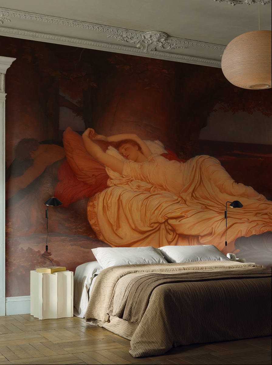 Ethereal Twilight Reverie Mural Wallpaper captures the serene beauty of a dreamscape where gentle figures recline beneath the twilight sky. The composition embodies a narrative of timeless elegance, with soft drapery and delicate hues inviting quiet reflection. Perfectly blending classical artistry with modern sensibility, this mural enhances both traditional and contemporary settings, offering a captivating centrepiece for any room.