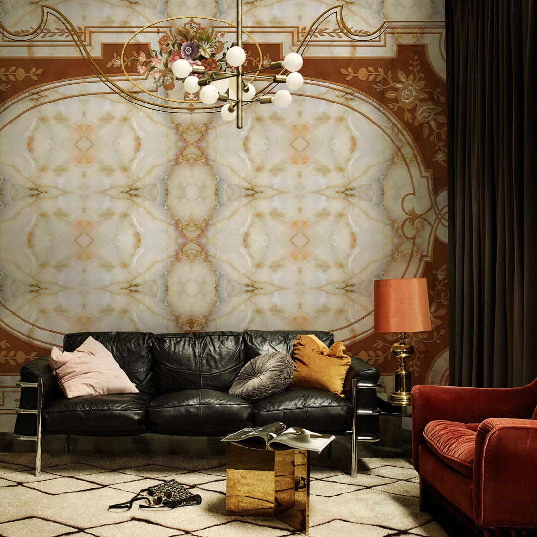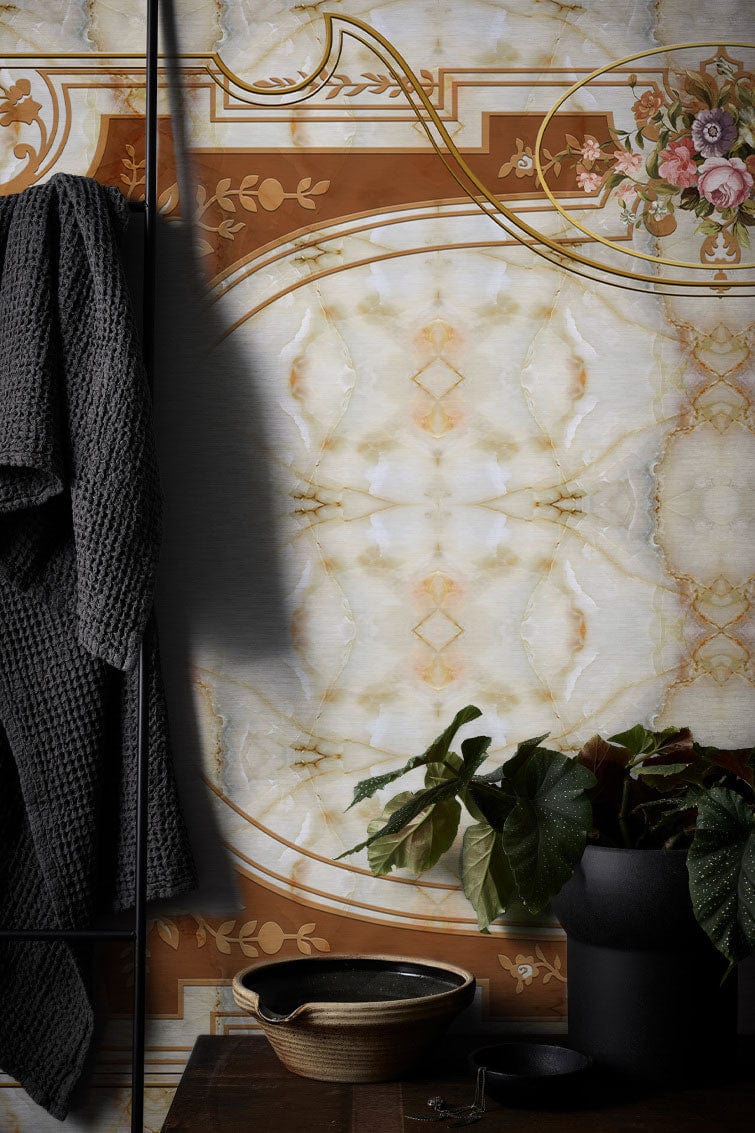 Immerse yourself in the opulence of European design with this crystal wallpaper mural. Exquisite geometric patterns interlace with ornate florals, evoking a sense of historical grandeur. Warm hues of gold, cream, and soft rose create an inviting backdrop, suitable for both classic and contemporary interiors. This mural embodies an artistic depth that brings a sophisticated allure to any space, seamlessly fitting into both grand living areas and intimate settings.
