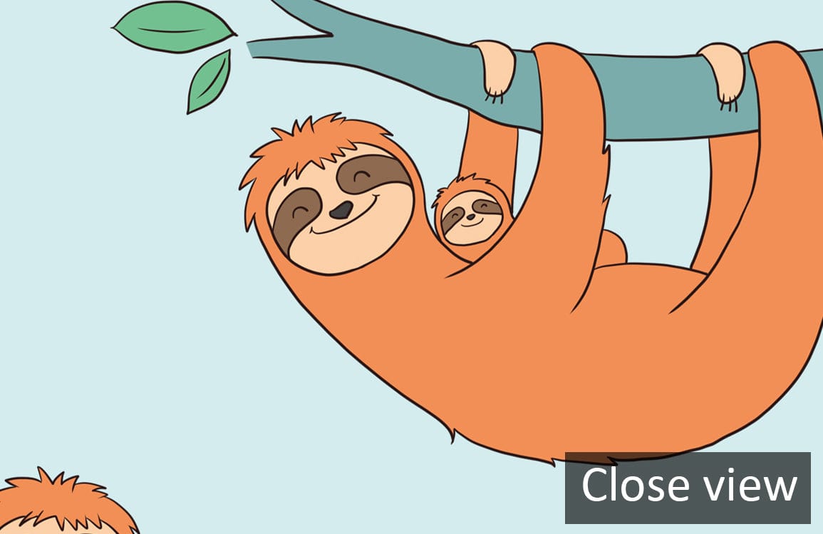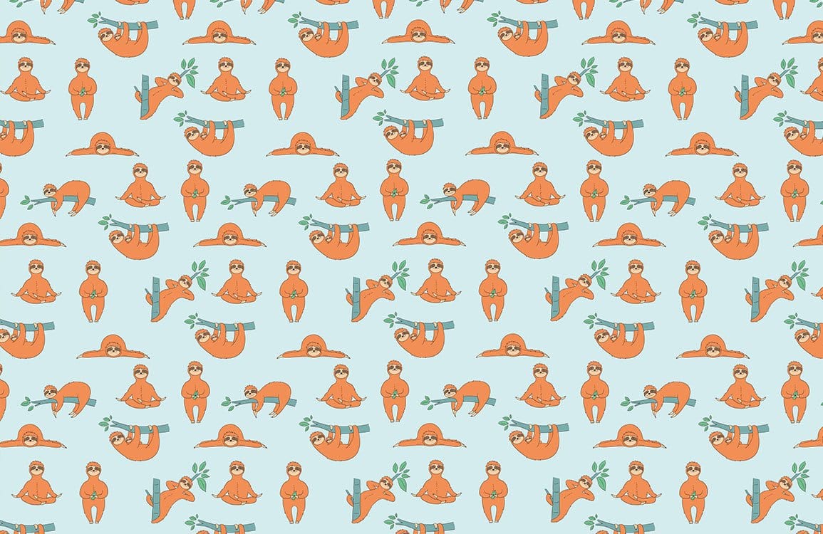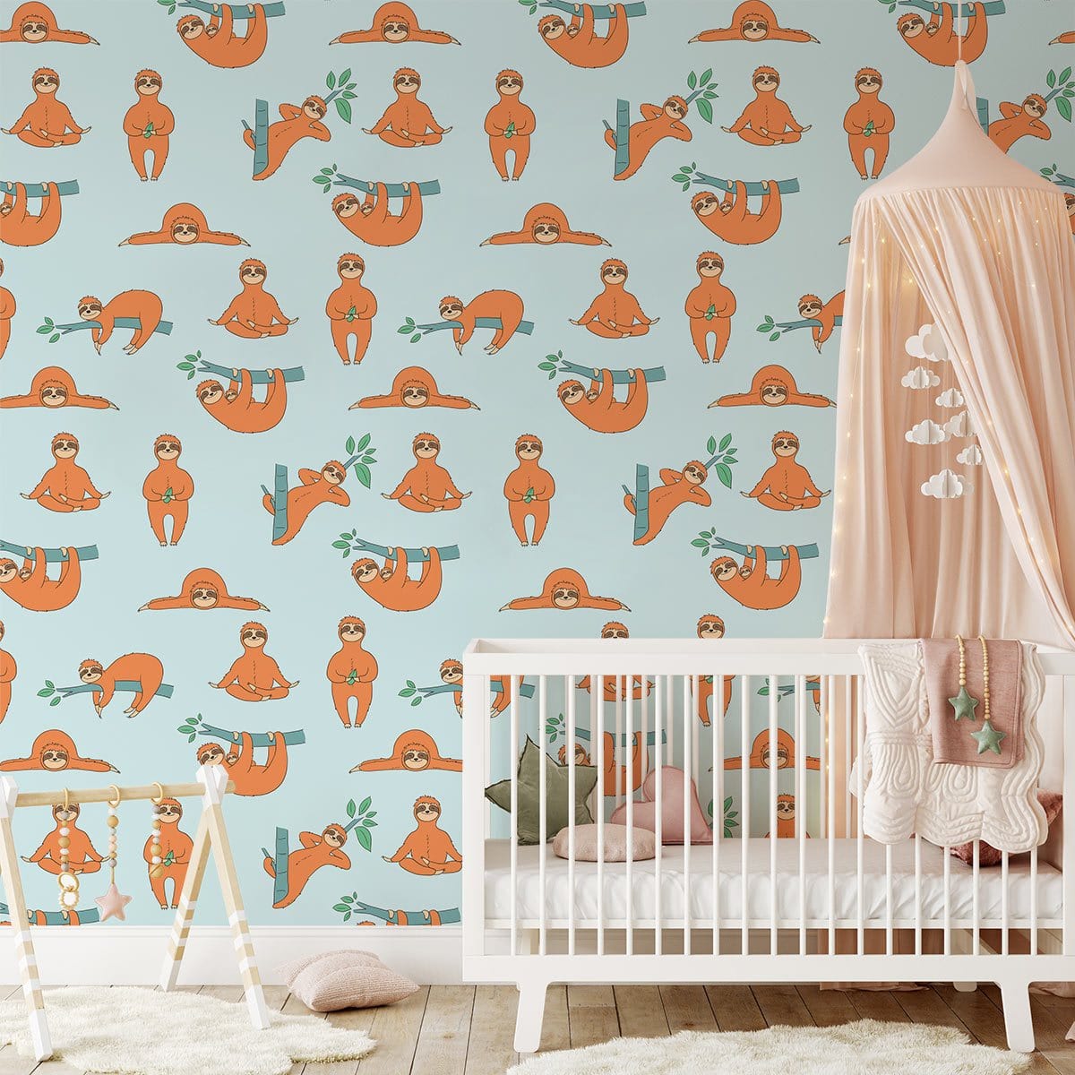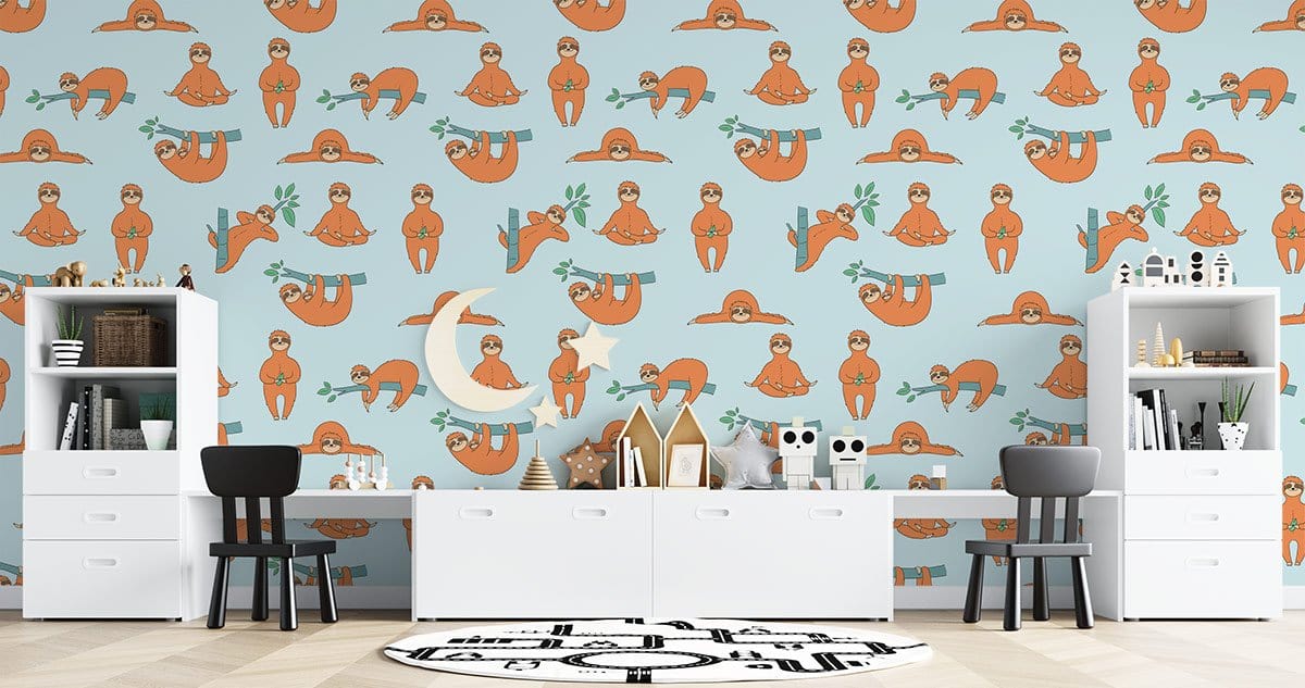 Your children are going to love this cute sloth pattern wallpaper mural! This wall mural featuring cute sloths doing exercises and stretching their bodies under pastel blue background is suitable for all kids room and baby nursery. Place this naughty sloth wall mural to your wall and enjoy the happiness and joy it brings to you and your children.