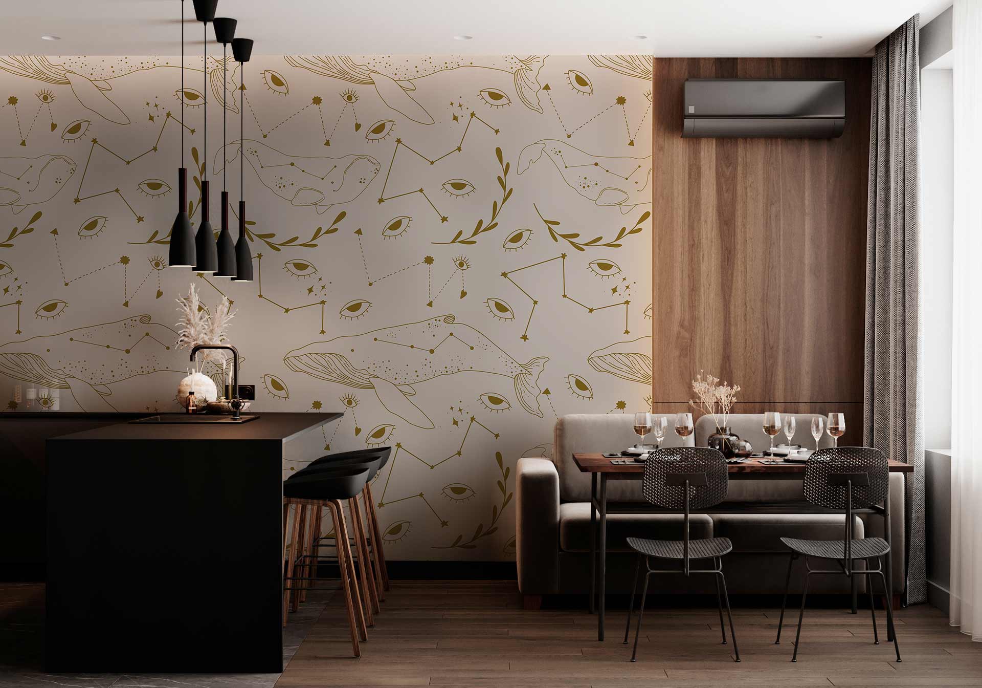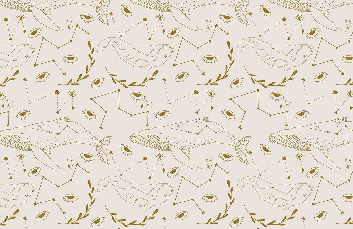 Dive into a serene underwater dreamscape with the Eyes & Whales Wallpaper Mural. Featuring fluid lines of gracefully swimming whales intermingled with delicate eye motifs and celestial constellations, this design evokes a sense of wonder and tranquillity. The meticulous detailing and soothing tones offer a timeless allure, adaptable to various interior palettes.