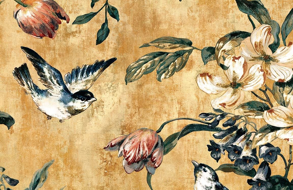 Immerse your space in elegance with this Fading Wallpaper Mural, where delicate birds and flowers adorn a backdrop of subtle golden hues. The intricate brushstrokes and sophisticated palette evoke a timeless essence, making this artwork a captivating centrepiece in any setting.