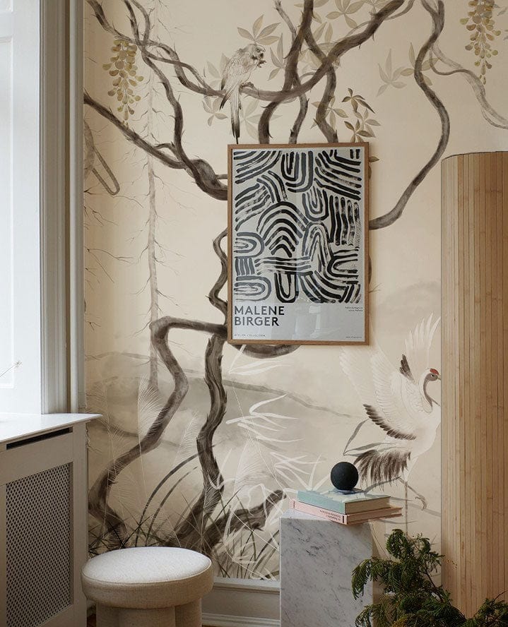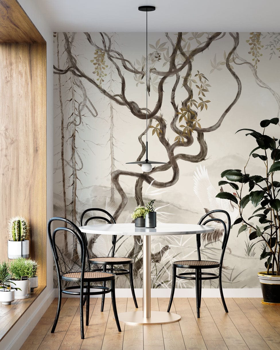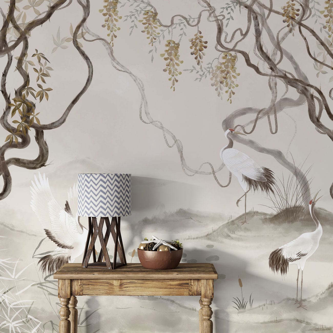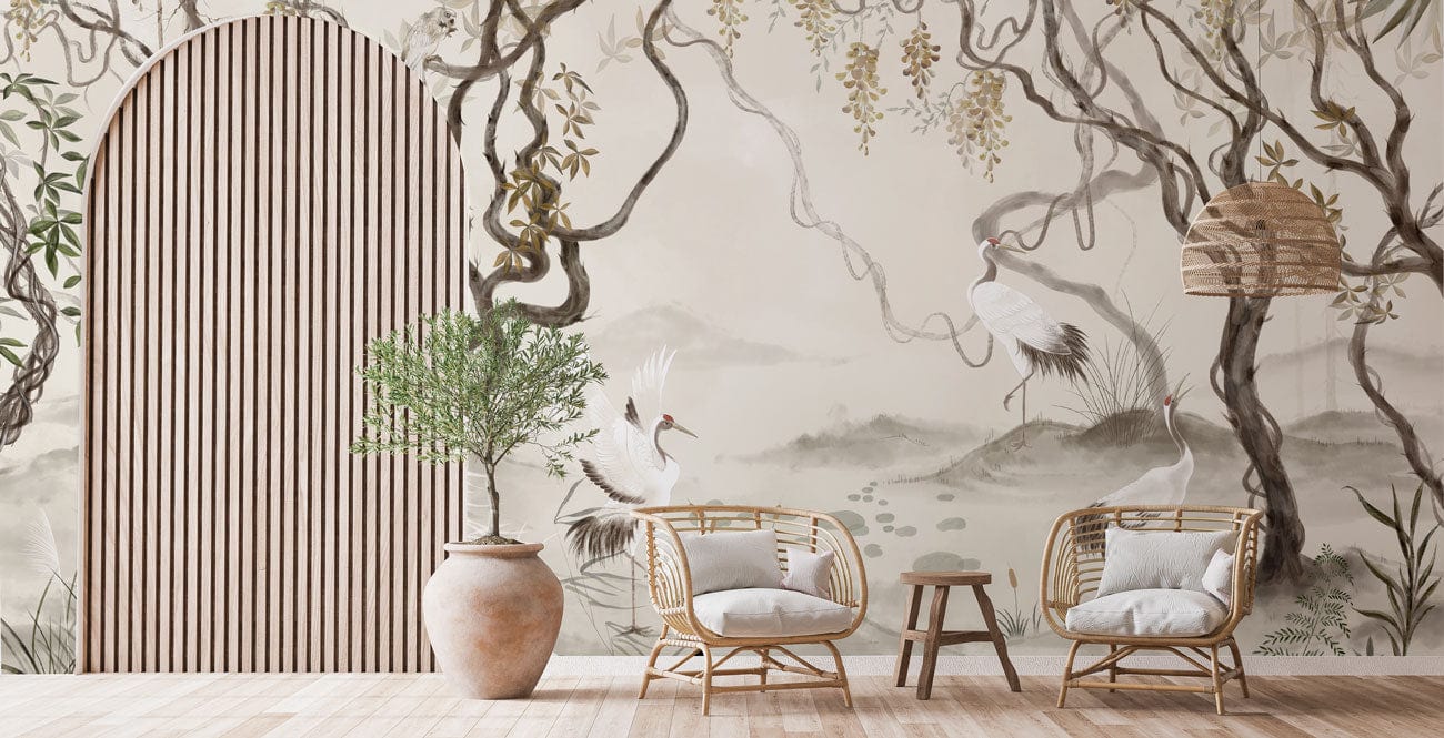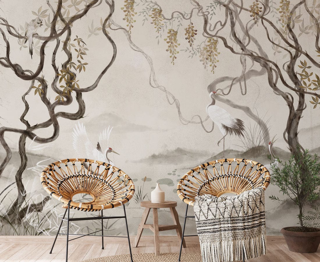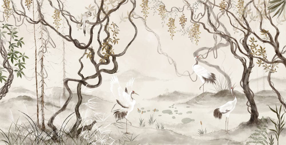 Immerse yourself in a serene woodland scene with the Fairy Cranes in Forest Wallpaper Mural. This exquisite design showcases elegant cranes amidst gracefully winding trees and delicate foliage, creating a tranquil yet sophisticated atmosphere. Its intricate artistry and soft hues breathe life into any space, offering a timeless charm perfect for refined interiors.