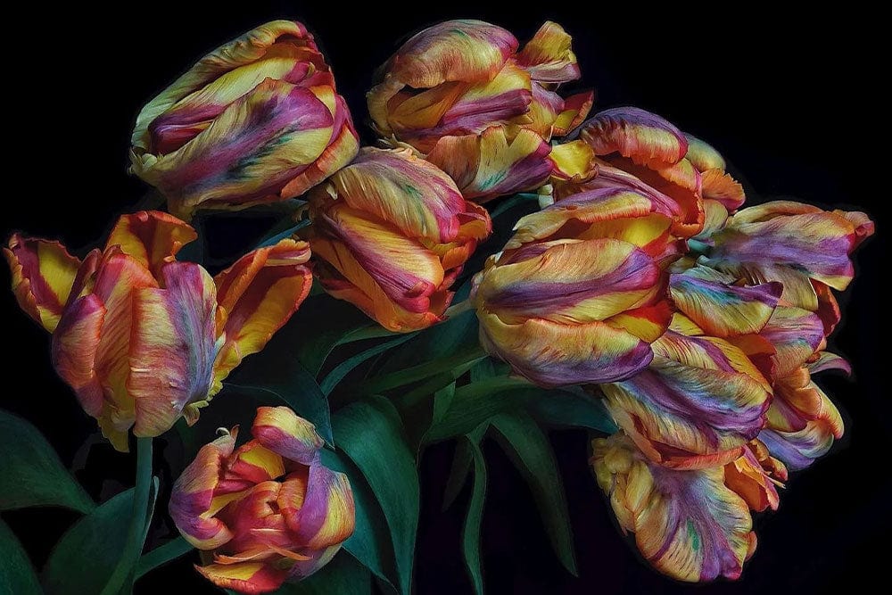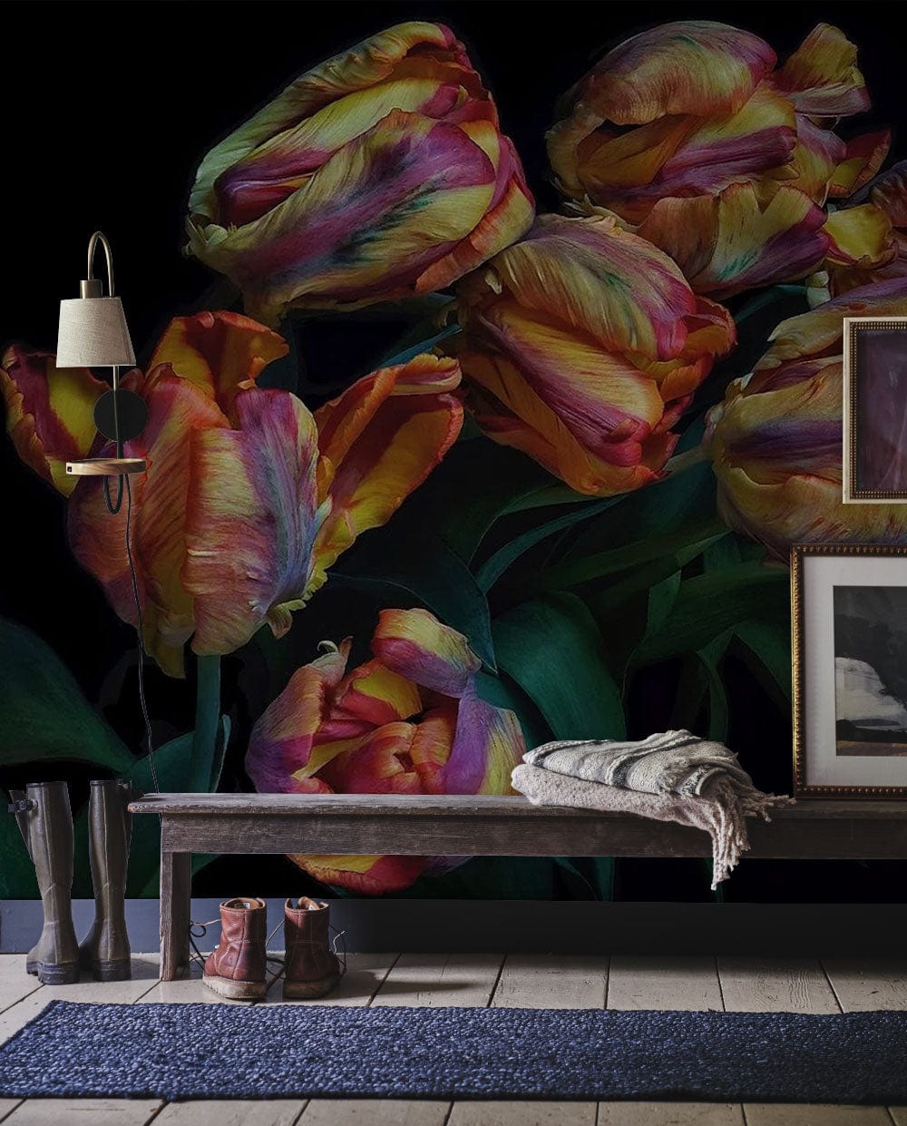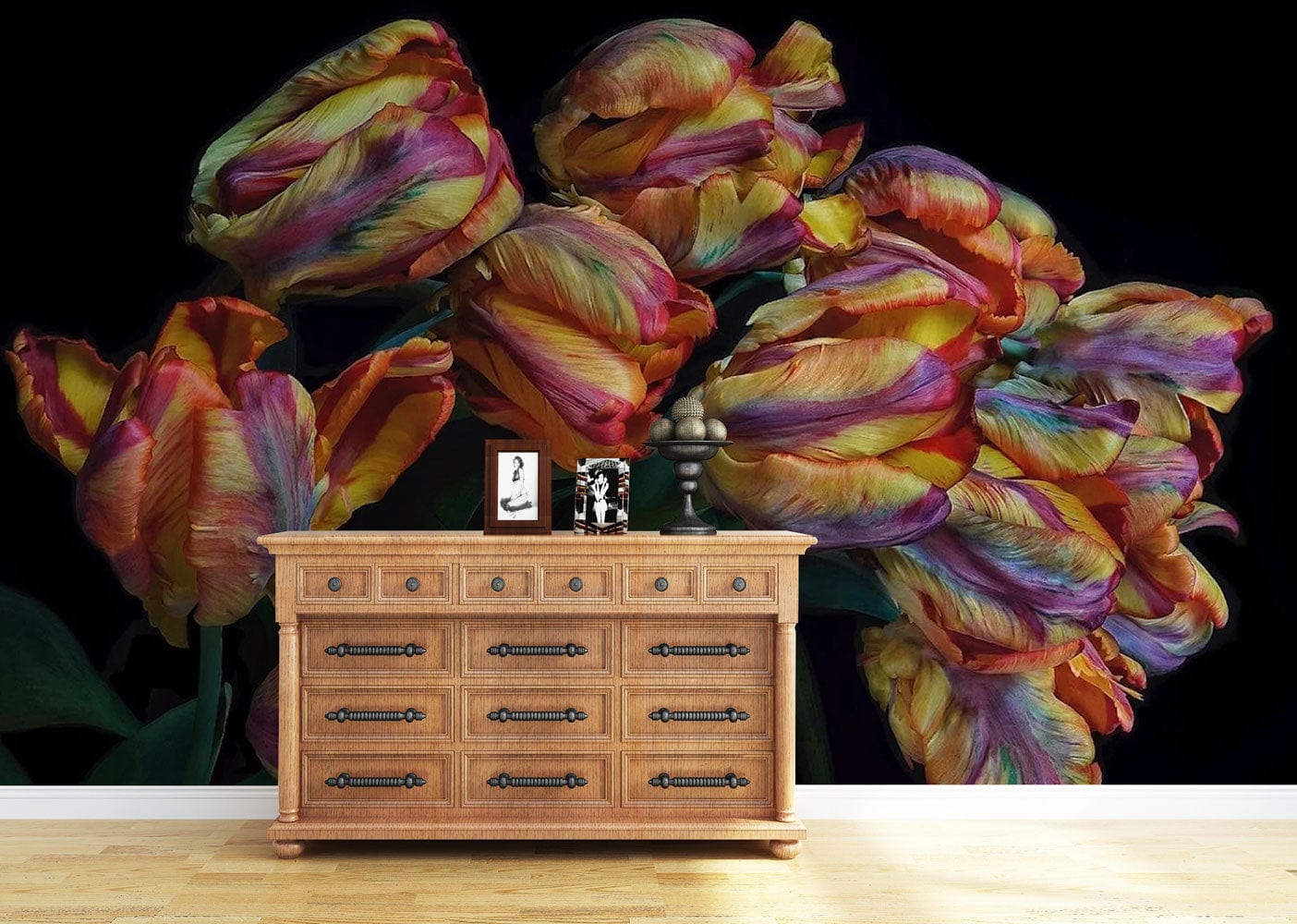 The Falling Tulips Wallpaper Mural captures the delicate elegance of tulips with an exquisite blend of hues, creating an atmosphere of refined beauty. The intricate floral design, set against a dark backdrop, highlights the vivid details of the petals, offering a sense of depth and movement. This mural effortlessly graces any room with a sophisticated and timeless charm, suitable for a variety of interiors.