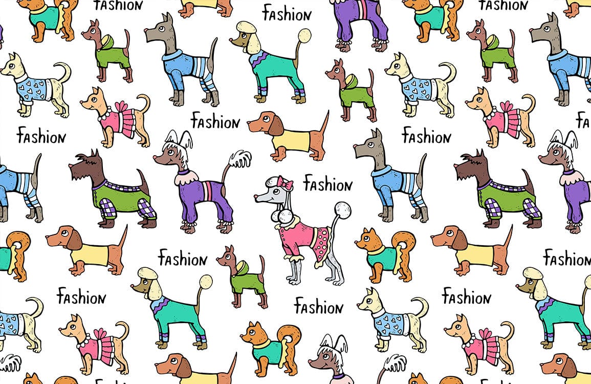 The Fashion Dogs Wallpaper Mural captures an imaginative parade of canines dressed in vibrant attire, blending contemporary whimsy with artistic finesse. Each dog is adorned in distinct, playful clothing that adds character and charm, providing a lively canvas that enlivens any space. The intricate patterns and varied poses bring a dynamic rhythm to the mural, making it an exquisite choice for both personal and professional settings.