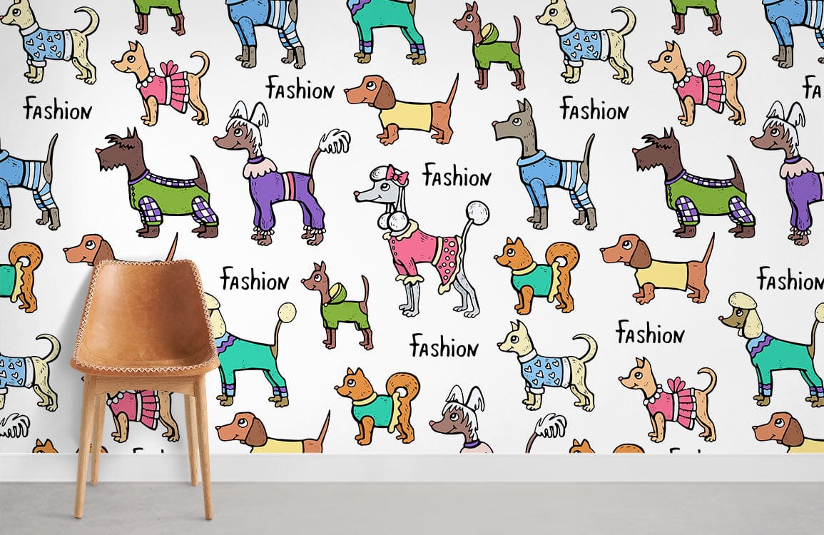 The Fashion Dogs Wallpaper Mural captures an imaginative parade of canines dressed in vibrant attire, blending contemporary whimsy with artistic finesse. Each dog is adorned in distinct, playful clothing that adds character and charm, providing a lively canvas that enlivens any space. The intricate patterns and varied poses bring a dynamic rhythm to the mural, making it an exquisite choice for both personal and professional settings.