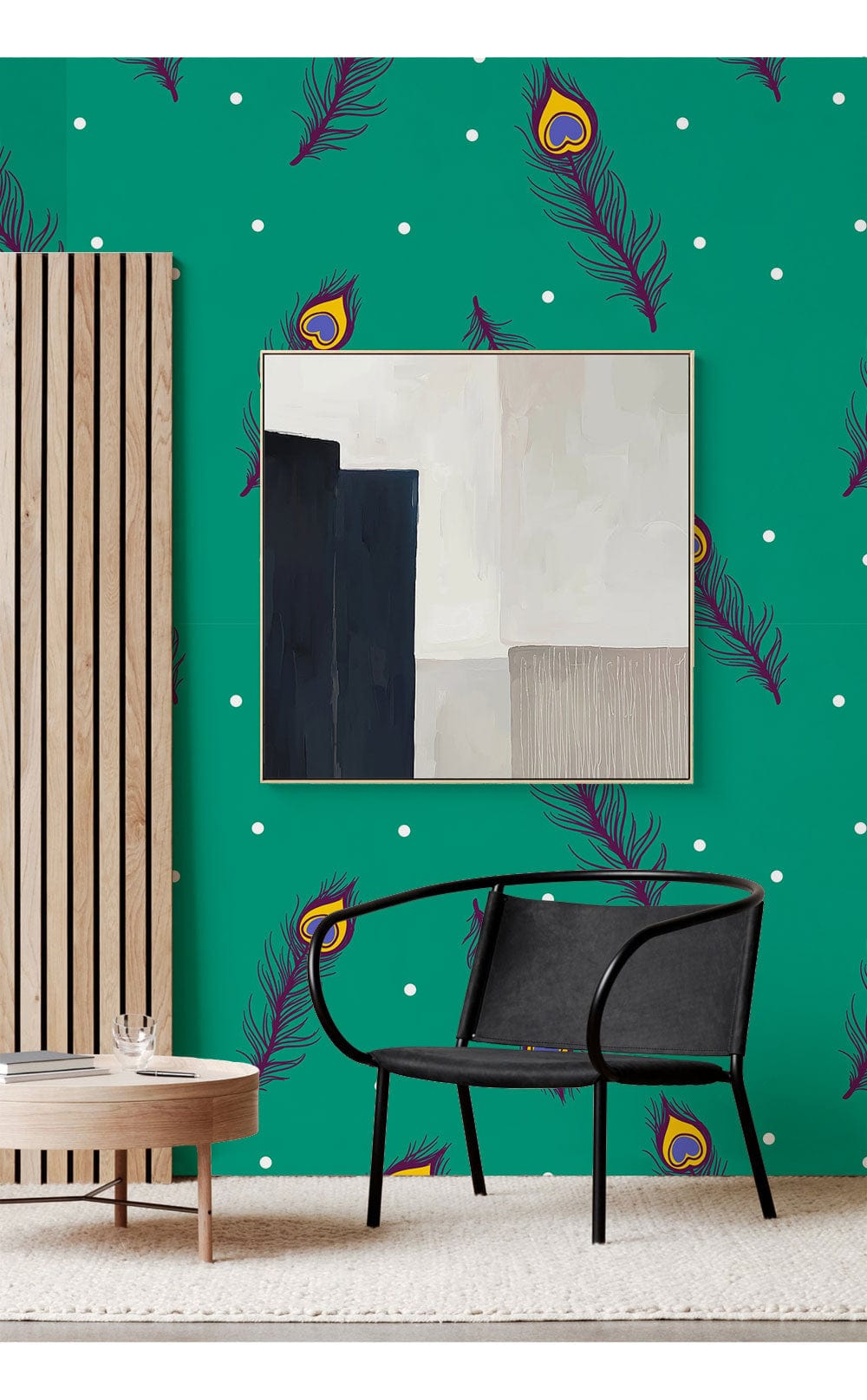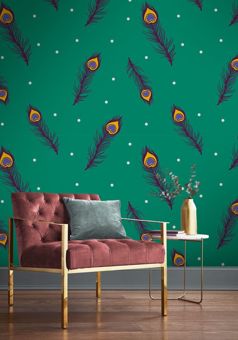 Immerse your space in a vibrant tapestry of elegance with the Feather on Vibrant Green Wallpaper Mural. This exquisite design features delicate feather motifs gracefully scattered across a rich green backdrop, punctuated with vivid peacock eyes in striking blue and gold accents. The intricate detailing and harmonious colour palette evoke a sense of timeless sophistication, making it an impeccable choice for any interior longing for a touch of nature and luxury.