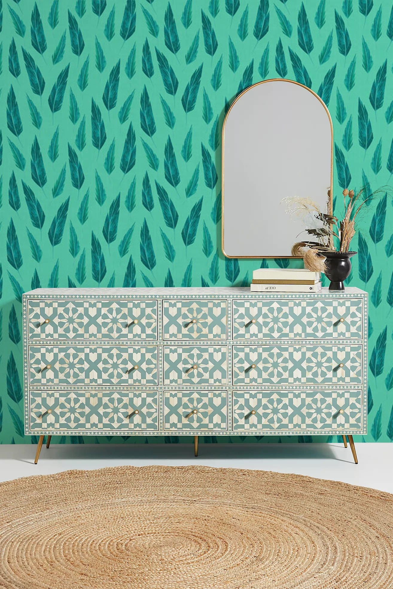 Grace your wall with this feather pattern wallpaper mural. This wall mural is designed with repeated pattern of feather in green-blue background, which will bring a vintage yet fresh look to your space. Perfect wallpaper that works well with all your bedroom, living room, kitchen and dining hall.