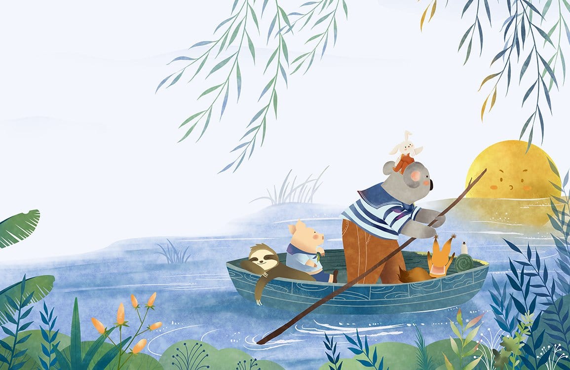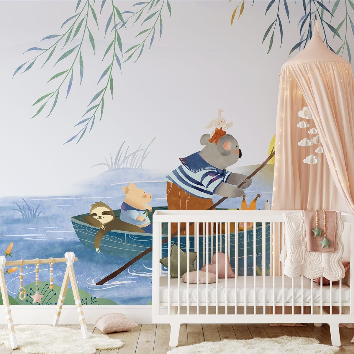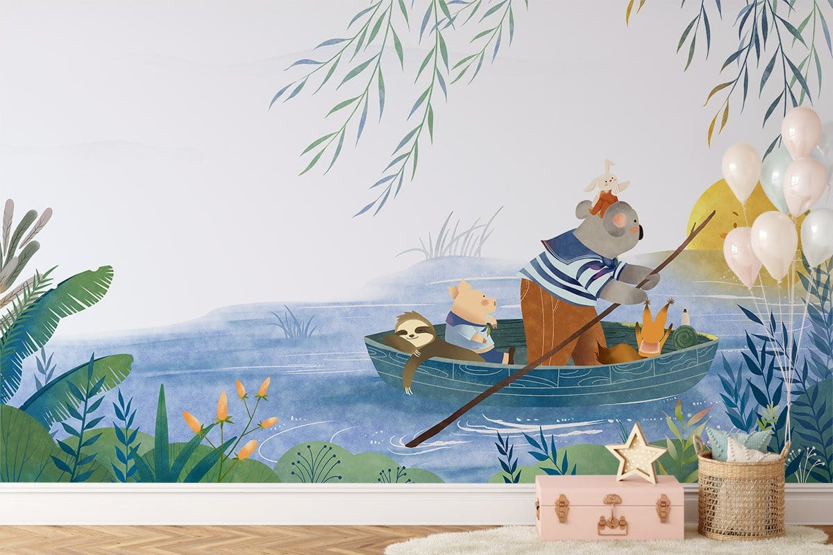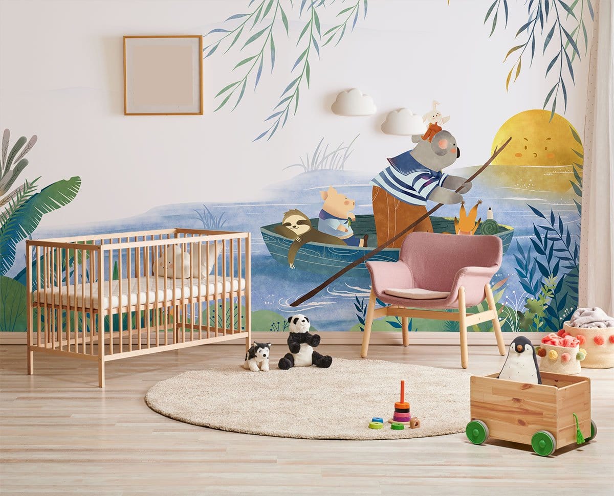 Let's chase the moonlight on the river together for fun with this adorable animal wallpaper mural. This wall mural featuring animals like koala and sloth rolling a booat sang chasing the moonlight on the river, which will take any kids room or nursery from plain to exciting with its playful design and fun, modern features. Match the wallpaper adorable tones by styling your children's space with lots of warm and soft colours, and keep things simple with a minimal mix of neutral and white decor.