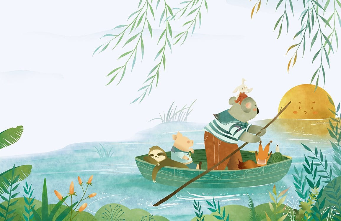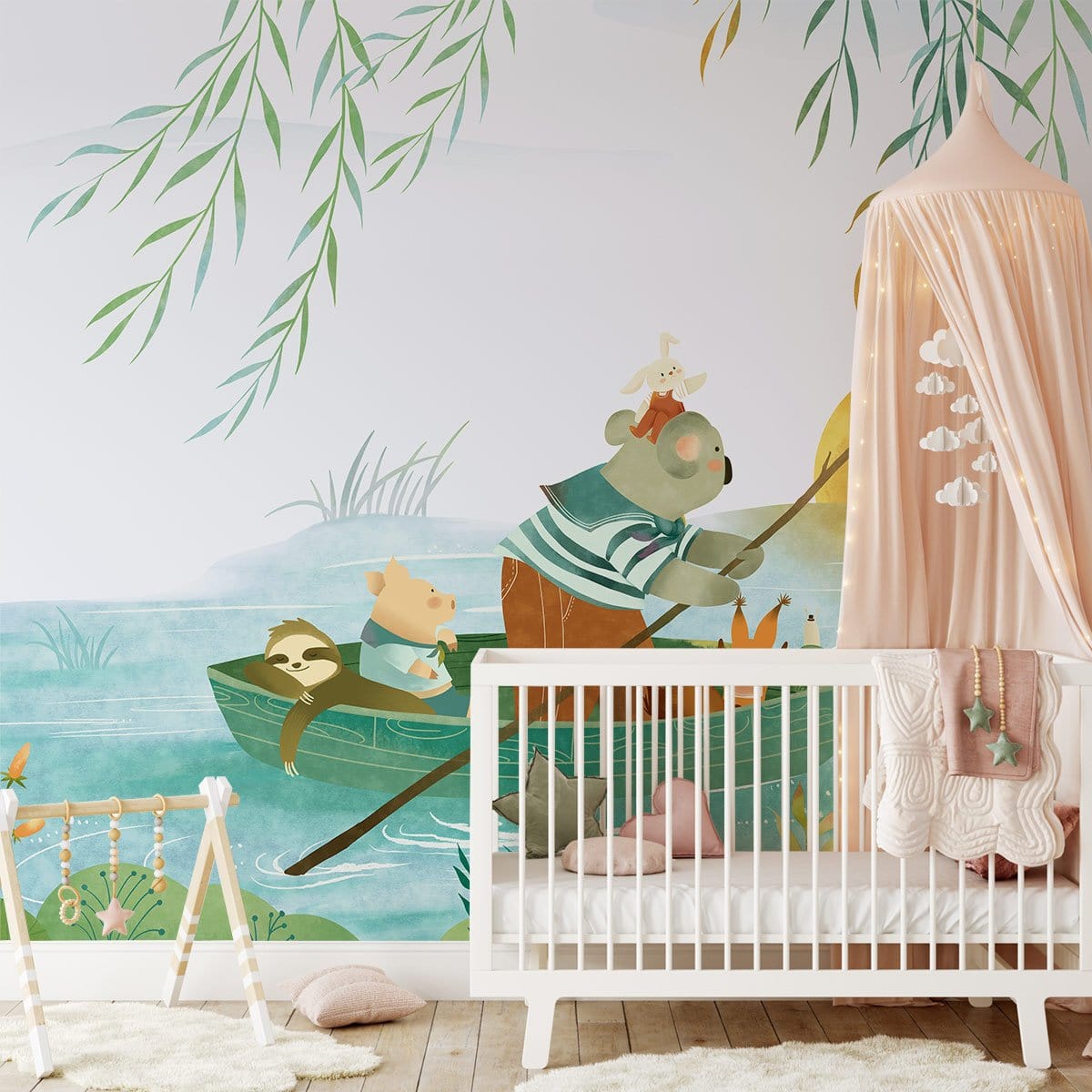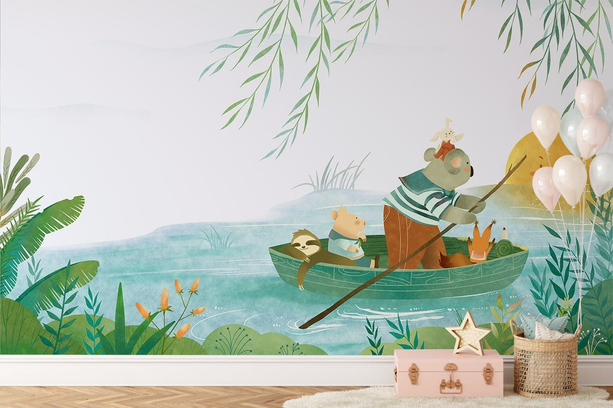Let's chase the moonlight on the river together for fun with this adorable animal wallpaper mural. This wall mural featuring animals like koala and sloth rolling a booat sang chasing the moonlight on the river, which will take any kids room or nursery from plain to exciting with its playful design and fun, modern features. Match the wallpaper adorable tones by styling your children's space with lots of warm and soft colours, and keep things simple with a minimal mix of neutral and white decor.