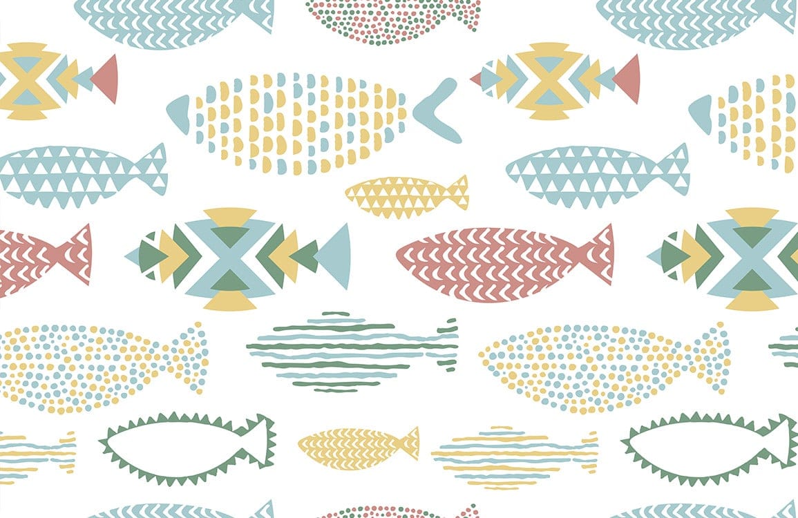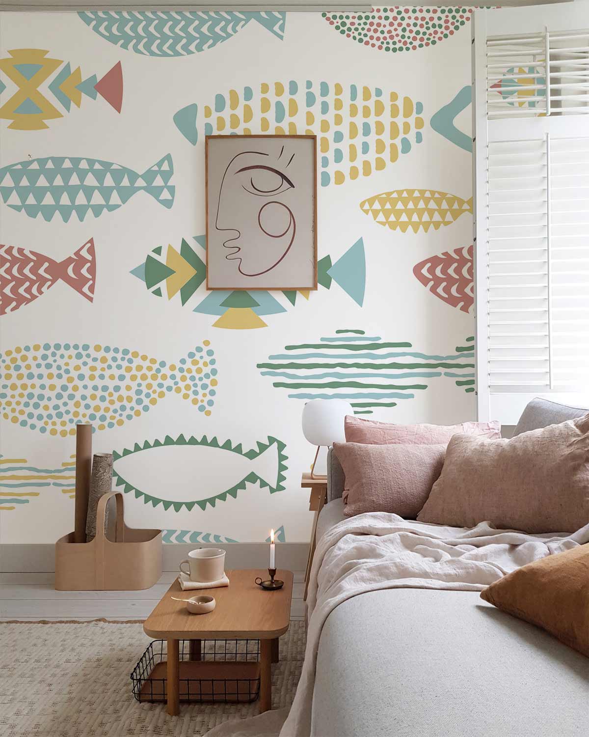 Enjoy a bohemian style at your home with this fish art mural. The mixture of the eye comfort colours and the randomly drawing yet real are one of the characteristics of the bohemian style. So, don鈥檛 miss this taste at your space and keep it so modern. The pastel colours make a very good print on the creamy white background that makes the place full of life and so relaxing. You can design your place with any colour of furniture from the wallpaper. This fish art mural will add a funky fish taste to any place, it can be at your living room with simple couches, or it can be at your dining room, or at your bedroom and it will still fit with different designs at each place.