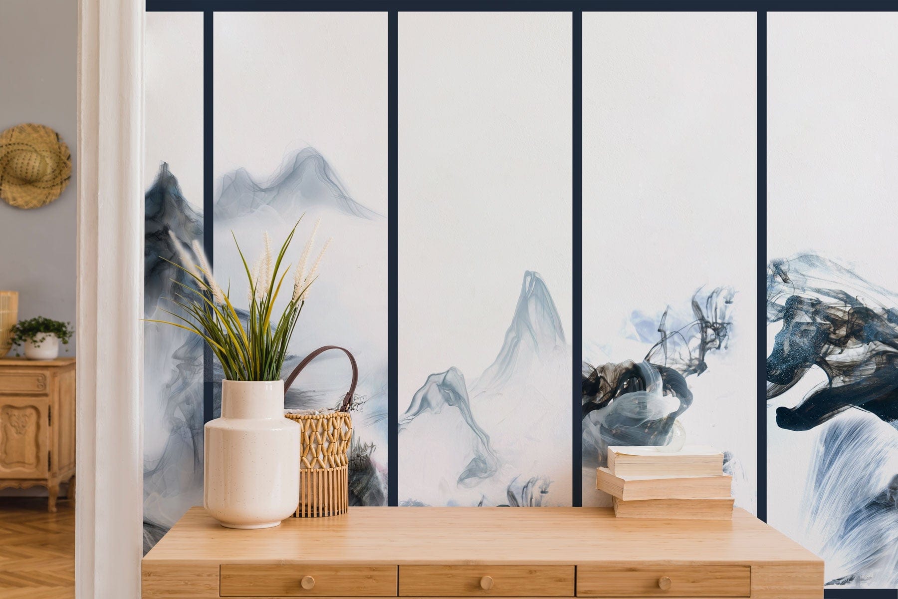 Immerse your space in serene sophistication with the Floating Ink Mountains Wallpaper Mural. This artwork elegantly captures the essence of misty mountain landscapes using fluid brushstrokes, evoking a sense of tranquillity and timeless beauty. The delicate interplay of shadow and light creates a breathtaking visual depth, making it an exquisite choice for modern and classic interiors alike.