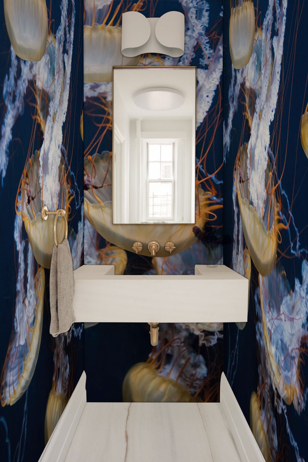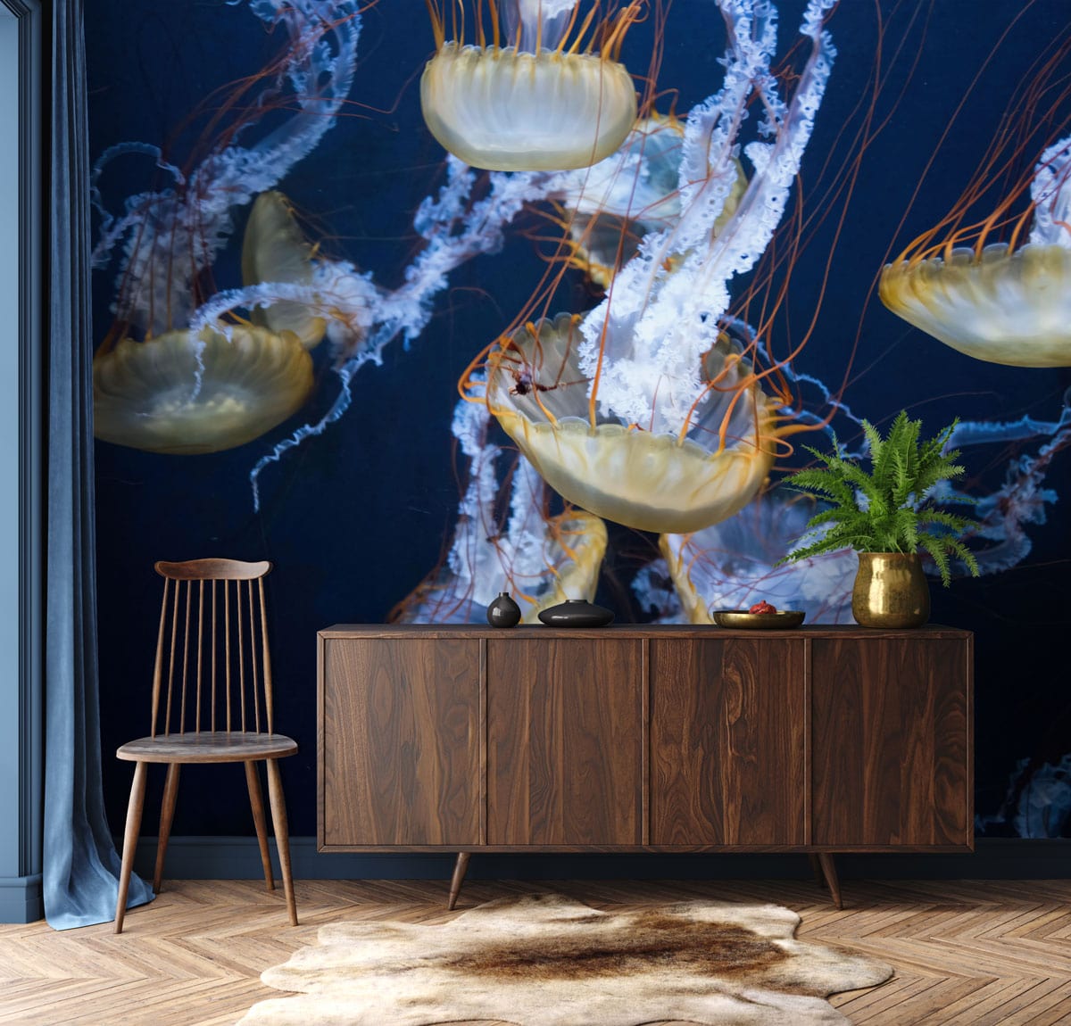 Immerse your space in the ethereal beauty of the ocean with the Floating Jellyfish Wallpaper Mural. This captivating design features graceful jellyfish drifting through deep, mystical blue waters, exhibiting a mesmerising dance. The intricate textures of the jellyfish create a dynamic blend of motion and stillness, offering a sophisticated ambience that complements a range of interior styles. Perfect for those seeking an artistic statement that adds depth and intrigue to their surroundings.