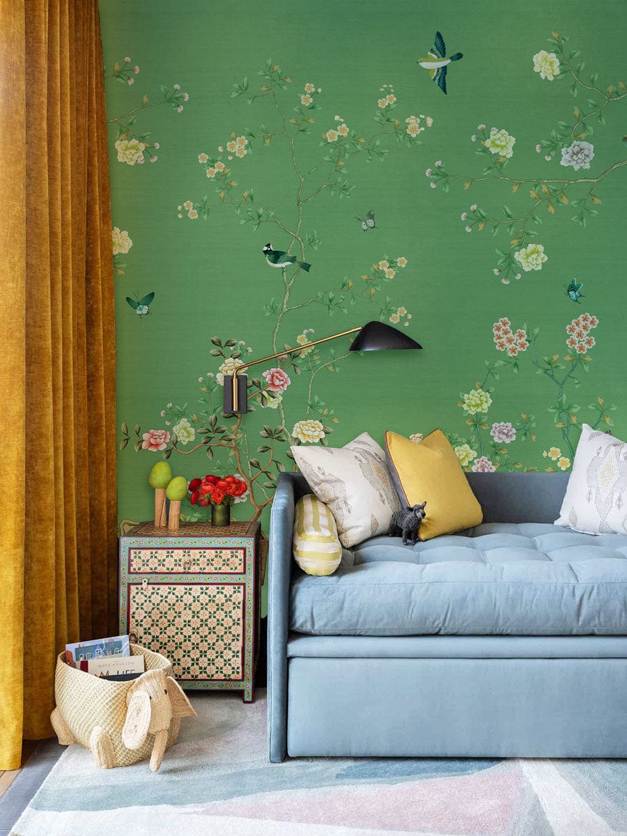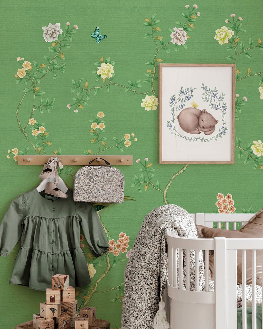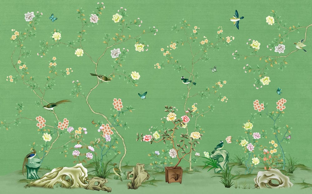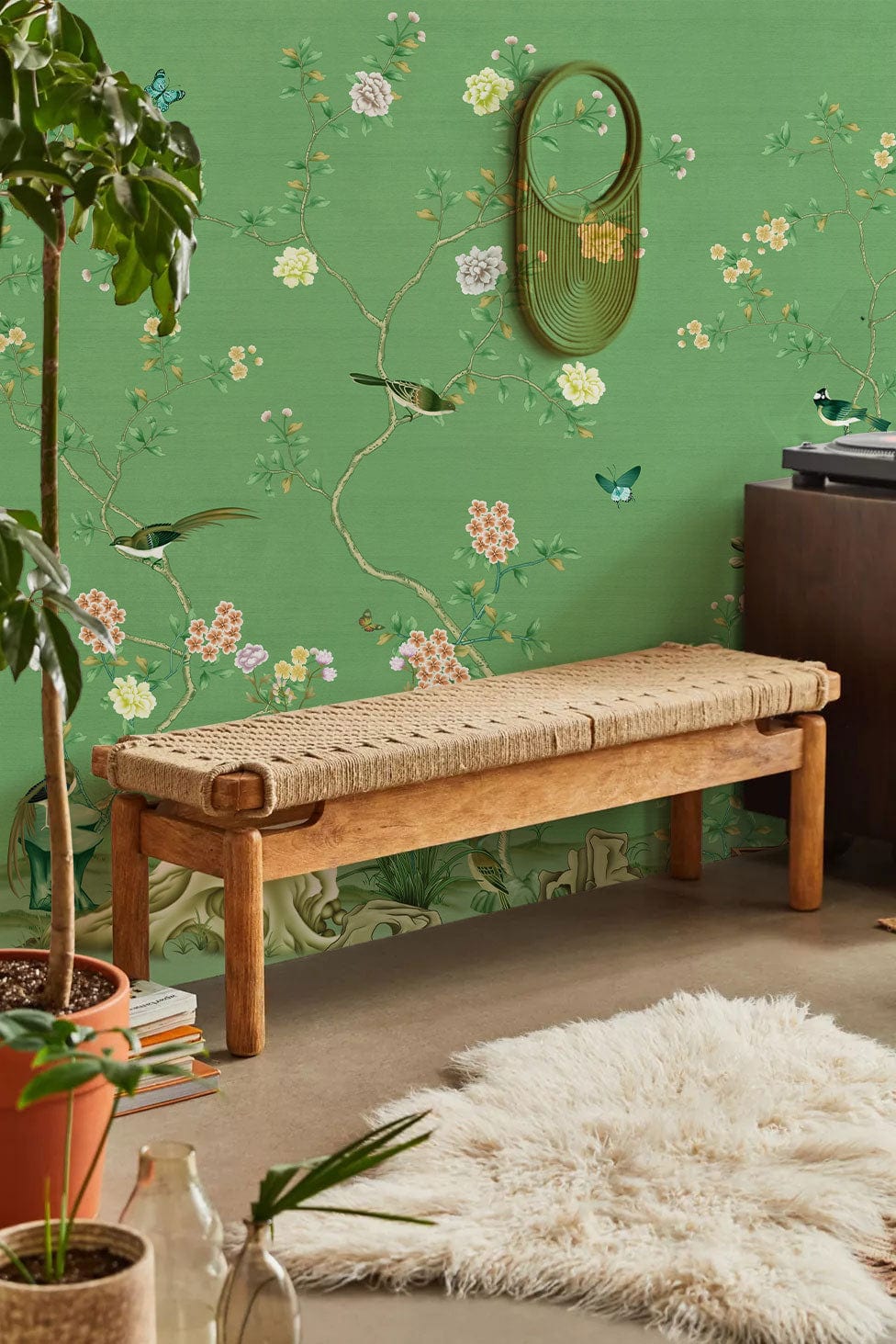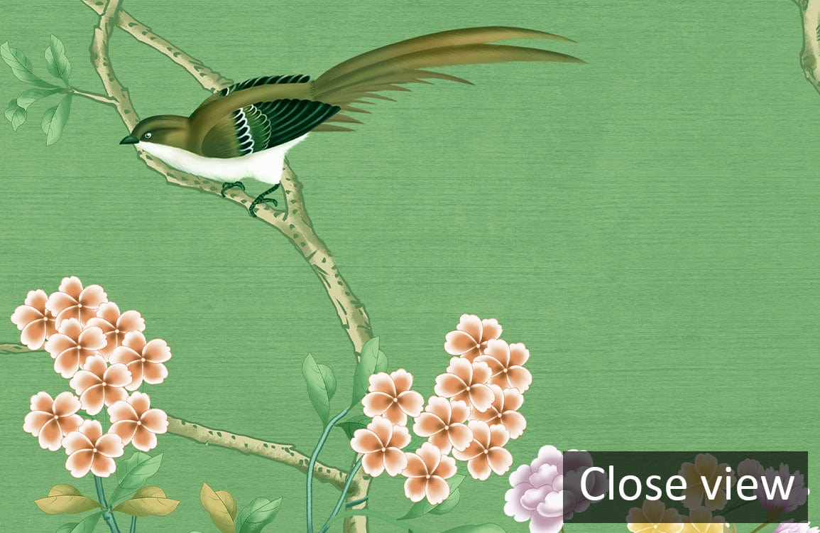 Immerse your interior in elegance with the Florescent World Wallpaper Mural. Its rich tapestry unveils delicate florals and graceful birds on a serene green backdrop, creating a harmonious blend of nature and artistry. Subtle textures and flowing lines bring a sophisticated charm, suitable for any space seeking timeless beauty and tranquillity.