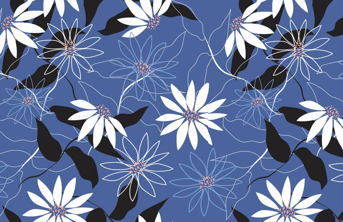 Immerse your space in elegance with this captivating Flower Wallpaper Mural. Showcasing a harmonious dance of bold white flowers set against a rich indigo backdrop, the mural features intricate line work that weaves through each bloom, exuding an aura of timeless sophistication. Ideal for spaces seeking a touch of nature's artistry, its alluring details and graceful balance make it a perfect fit for both traditional and modern interiors.