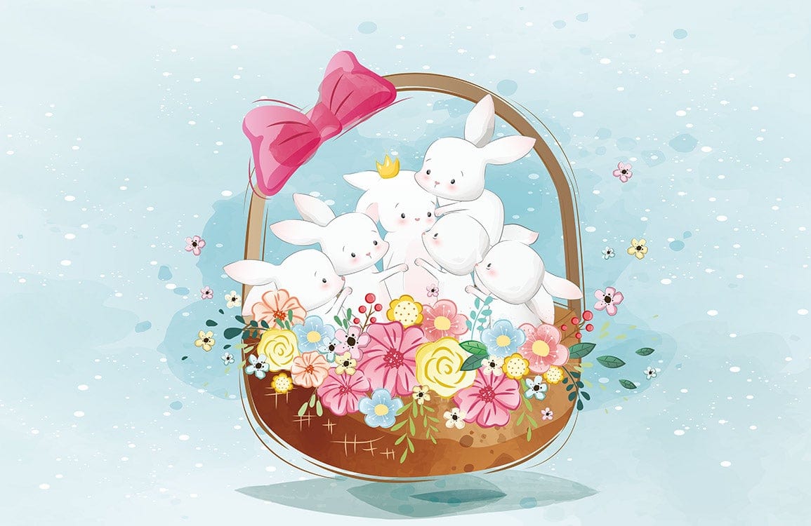 If you love cute home decoration, this flower basket rabbit mural wallpaper is a sure bet. This mural wallpaper transforms the look of an entire room and makes it feel more open and dynamic. The floral design is striking, with flowers in beautiful pinks, blues, and yellows that bring to mind springtime in the countryside. The large rabbits in the center are playful and delightful and are sure to add character to your child's room. With lovely cartoon designs and nice colours, these adorable rabbits create an interesting atmosphere to blanket your wall.