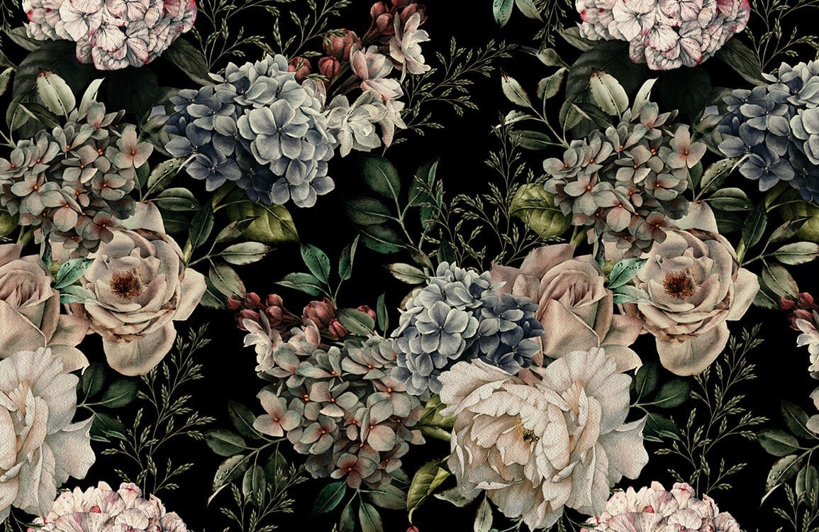 Immerse yourself in the timeless beauty of the Blooms Wallpaper Mural, where delicate roses and lush hydrangeas weave a tapestry of elegance against an enchanting dark backdrop. Each floral detail is intricately rendered, evoking a sense of refined artistry that adds depth and sophistication to any space, be it contemporary or traditional.