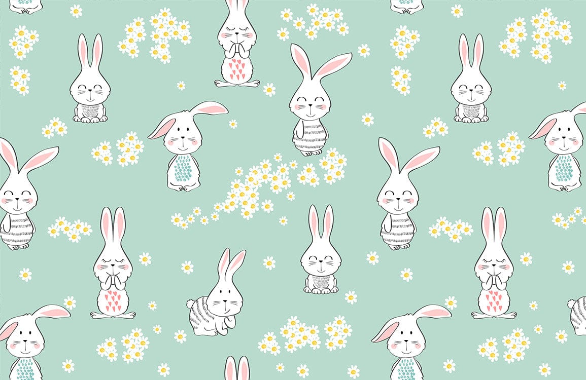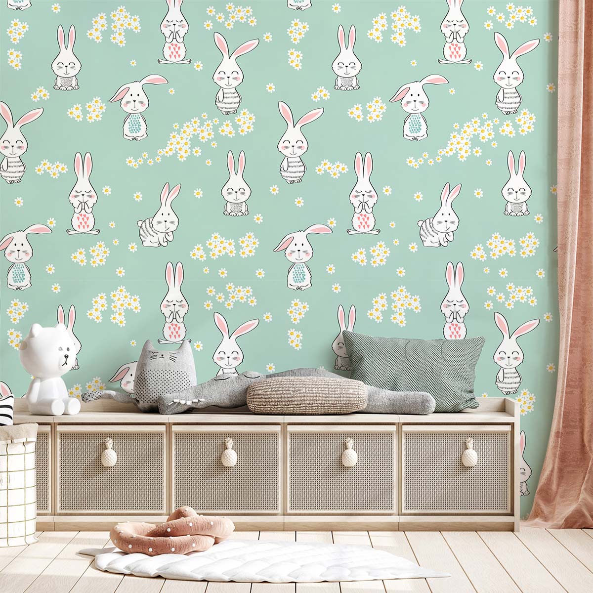 Infuse your space with the whimsical charm of the Flower & Bunny Wallpaper Mural. Delicately illustrated bunnies and scattered daisies set against a gentle mint backdrop provide a playful yet sophisticated aesthetic. This mural adds a touch of ethereal beauty to any interior, capturing a timeless elegance that suits both contemporary and classic settings.