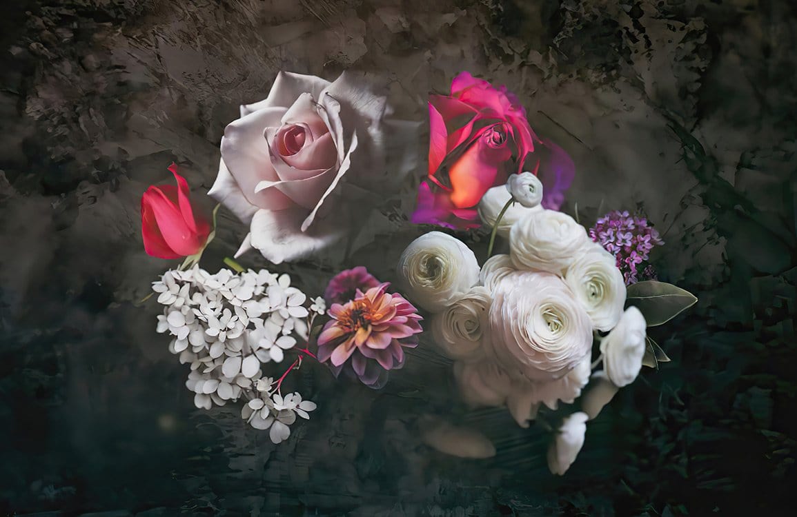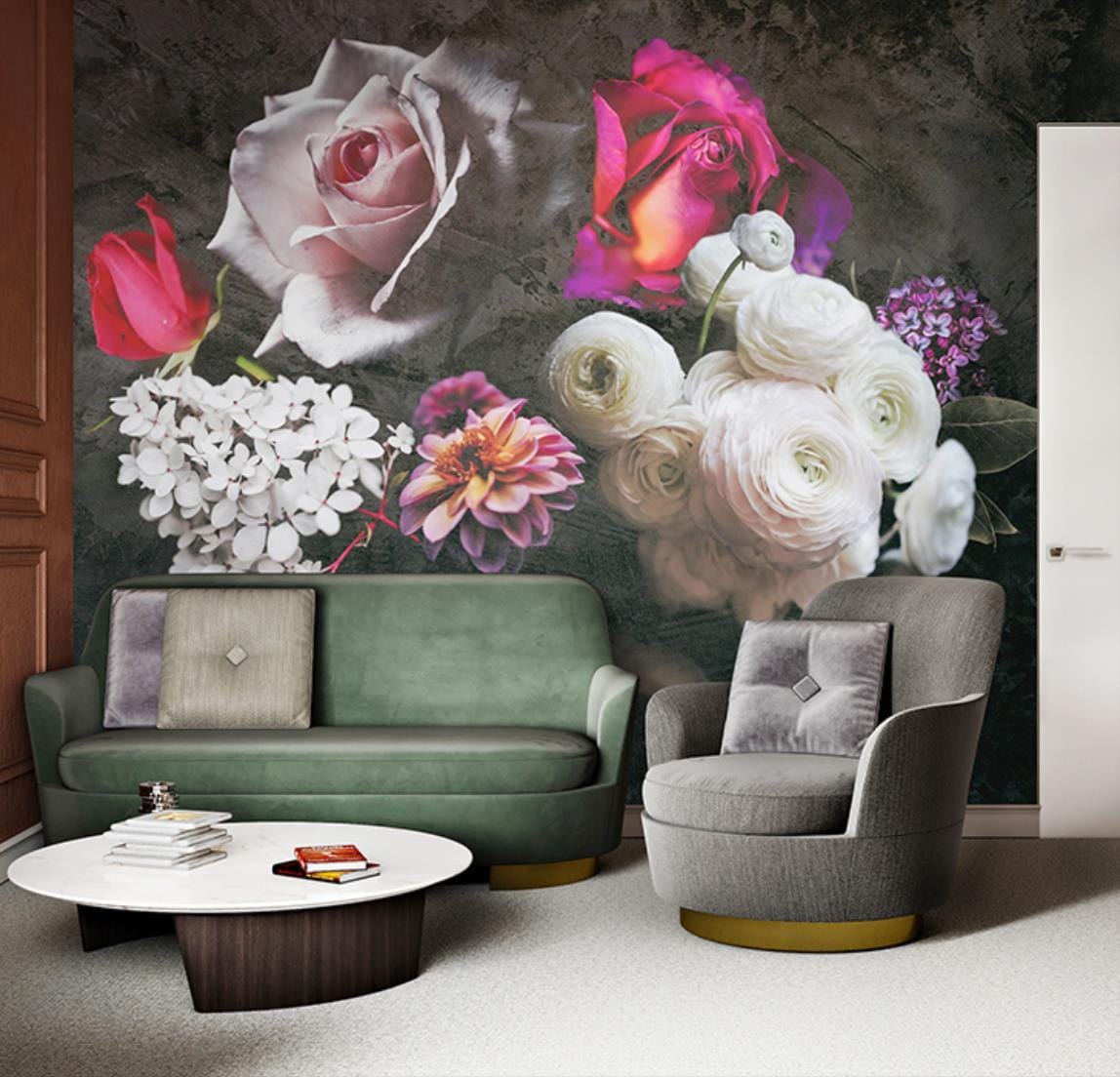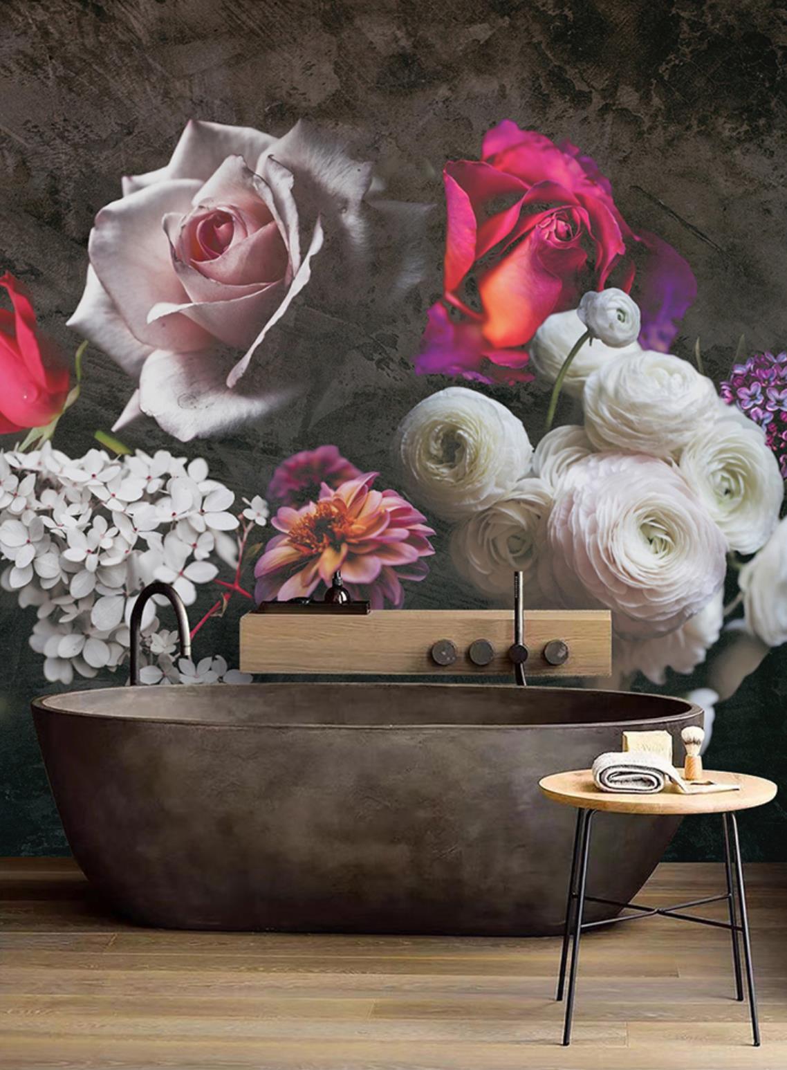 Create a flower cluster in your home with this elegant wallpaper mural. The colourful roses and wildflowers against the dark backdrop creates a vintage effect with a sophisticated look. The roses are saturated with colours in a way that the design is awarded an impeccable glamour that is hard to miss. Perfect to pair with your modern furniture in your living room, bedroom and dining area.