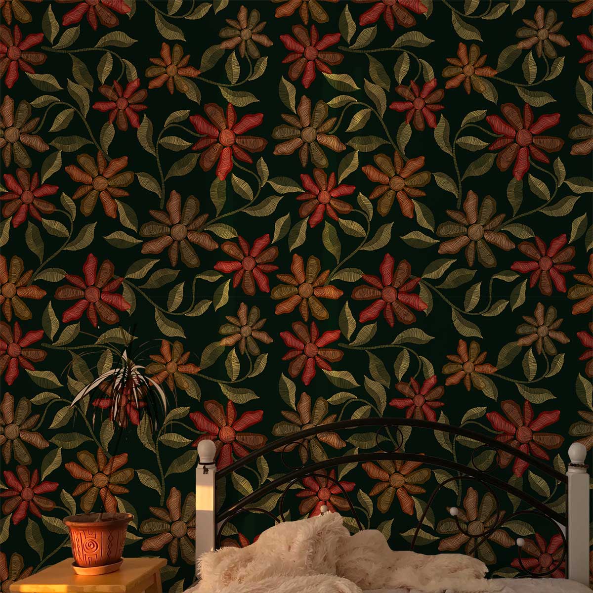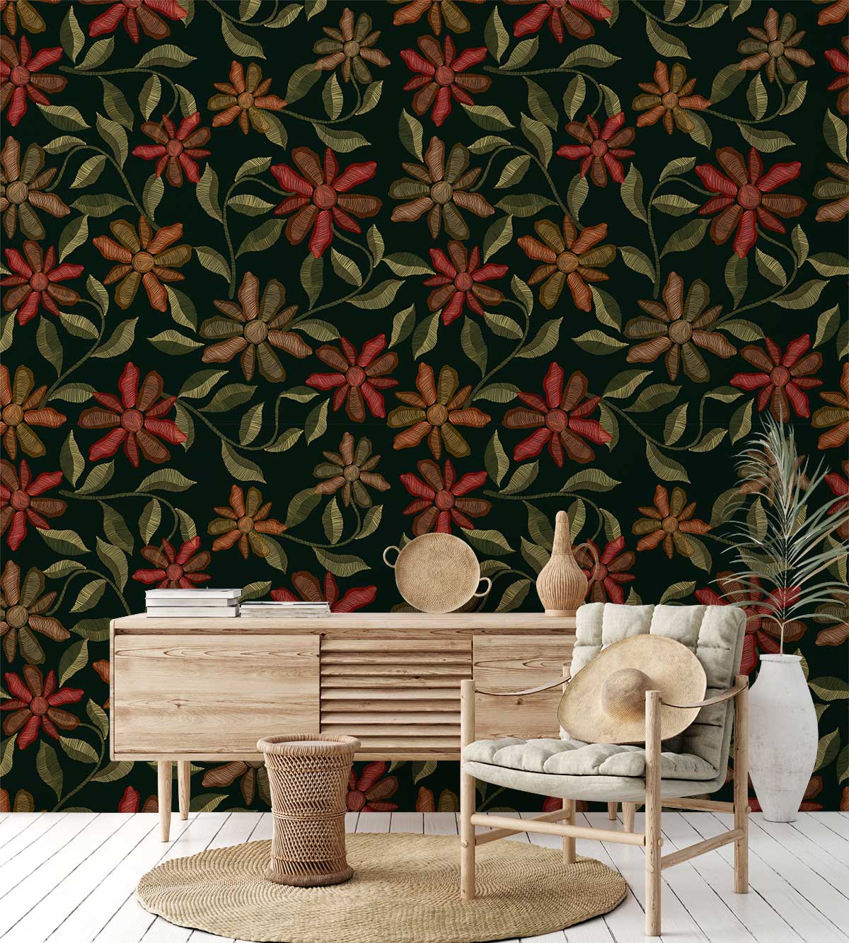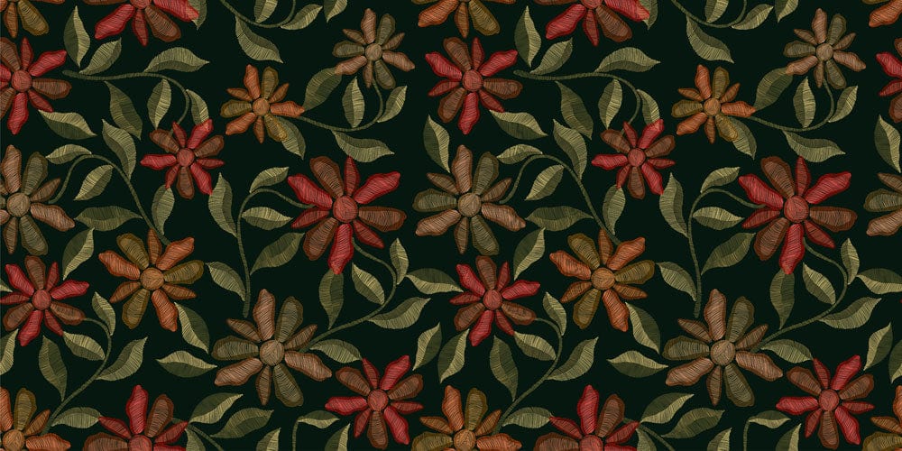 Immerse your space in the intricate beauty of an embroidered garden with this exquisite flower wallpaper mural. Delicate floral motifs in rich russet, verdant green, and soft beige hues create a striking visual tapestry that evokes the timeless artistry of traditional needlework. Perfect for adding a touch of sophistication, it gracefully enhances a variety of interiors, from classic to contemporary.