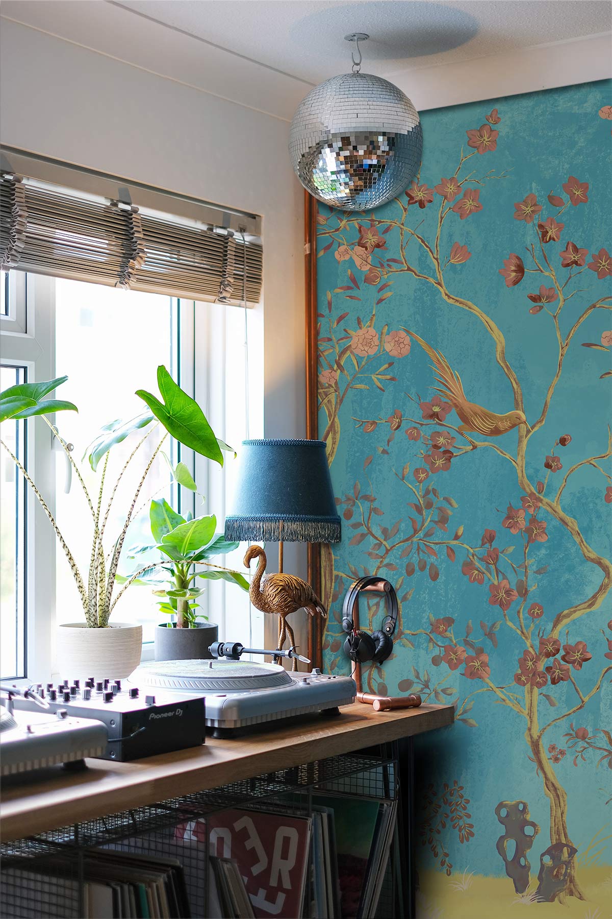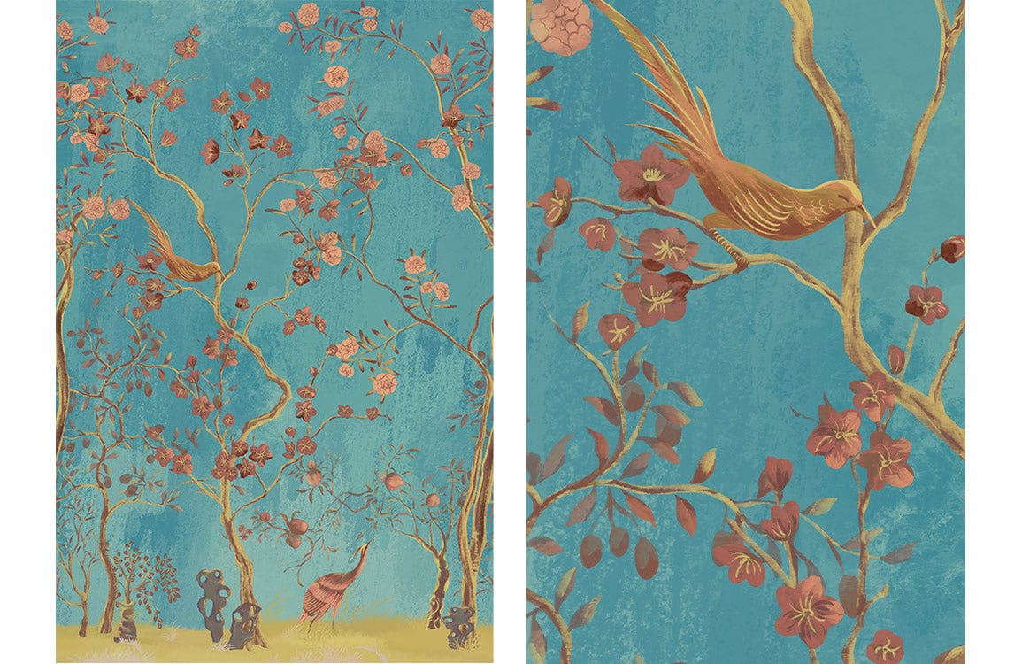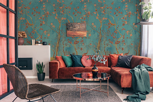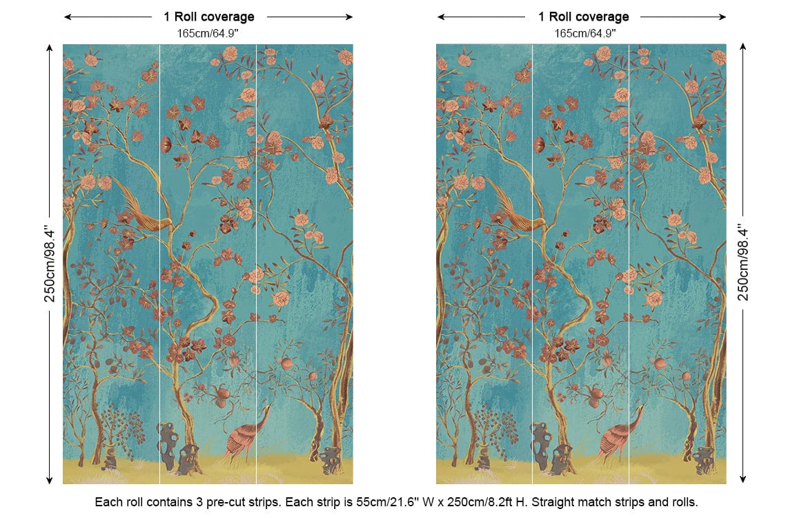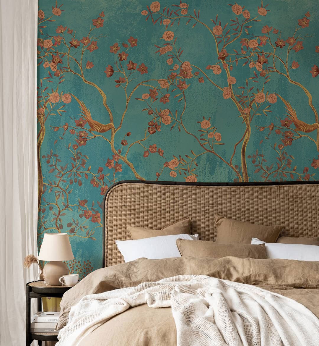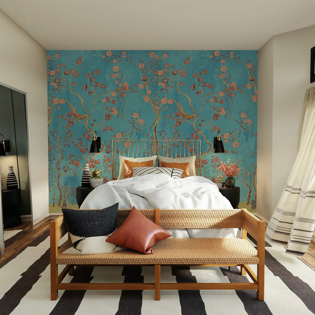Immerse your space in the gentle elegance of the Flowering Branches Wallpaper Mural, where intricate floral patterns weave across a serene blue backdrop. Delicate pink blossoms and graceful birds create a sophisticated tapestry that adds a timeless charm to any room. Its detailed artistry and subtle texture make it an exquisite choice for those seeking an artistic yet calming ambience.