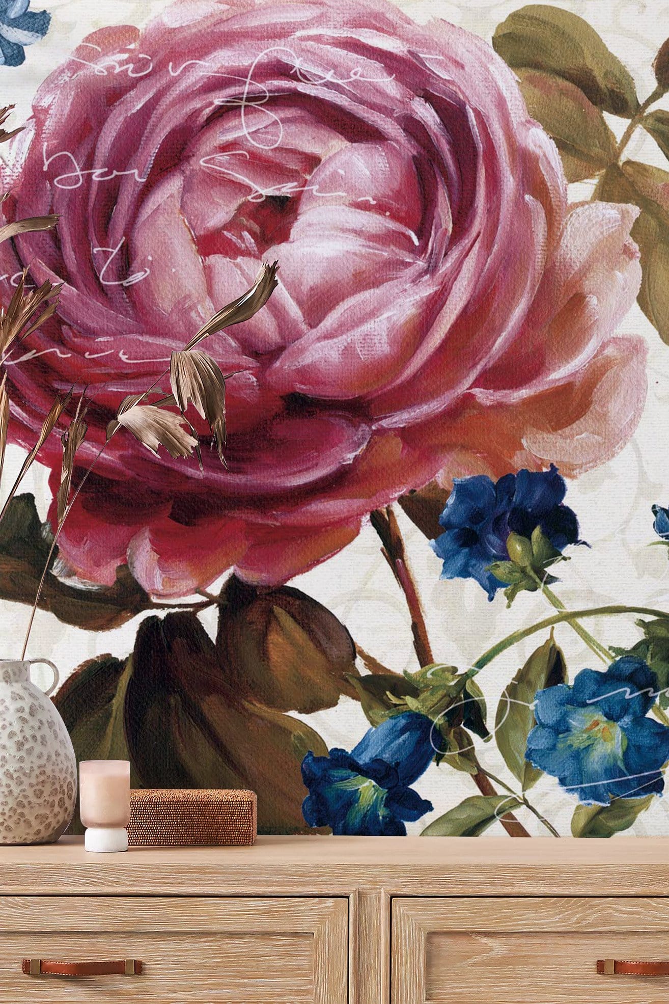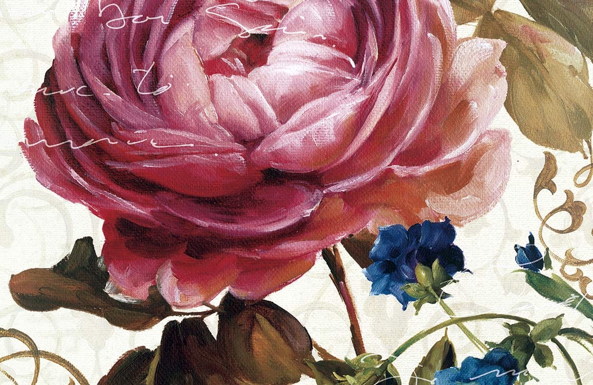 Invite the beauty of a timeless garden into your home with this exquisite Flowering Wallpaper Mural. The design captures the delicate layers of blooming petals intertwined with occasional handwritten script, adding an intriguing personal touch. Impeccably detailed in rich shades, this mural evokes the romance of a classic painting, poised to bring a sense of tranquillity and elegance to various interiors.