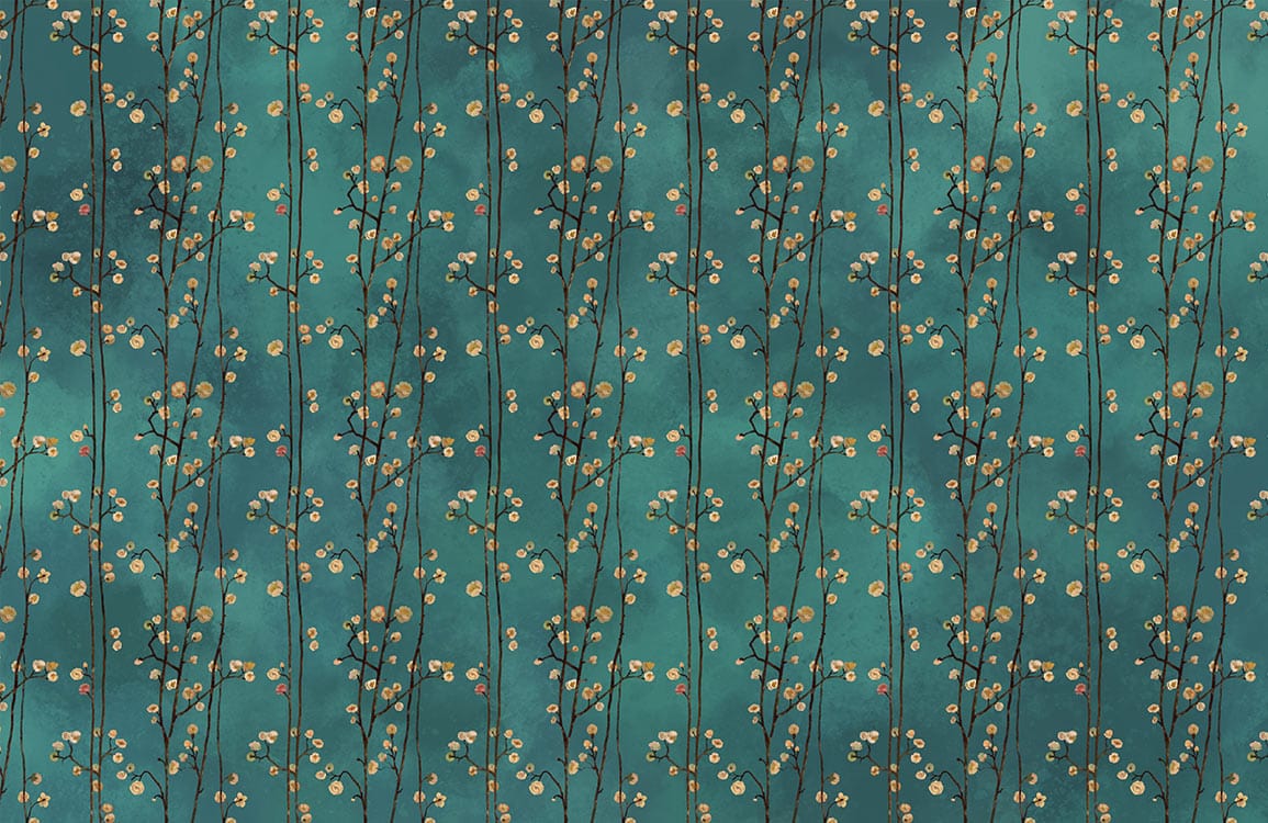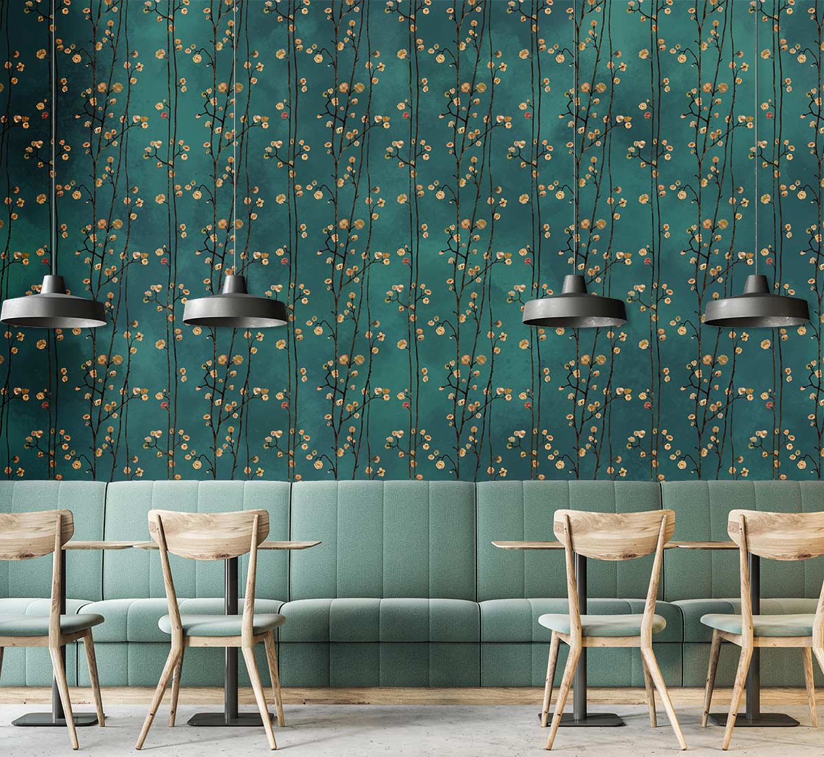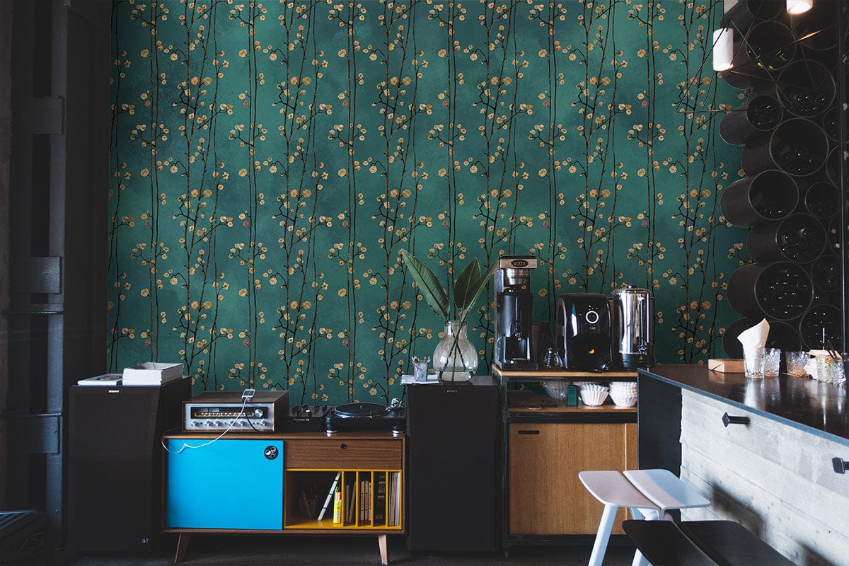 Immerse your interior in a tapestry of delicate elegance with the Flowering Vines ll Wallpaper Mural. Exquisite strands of botanical artistry weave through a lush teal backdrop, punctuated by subtle hints of amber and muted white blossoms. This mural exudes a timeless charm, making it a harmonious addition to any setting, from sophisticated living areas to serene bedrooms.
