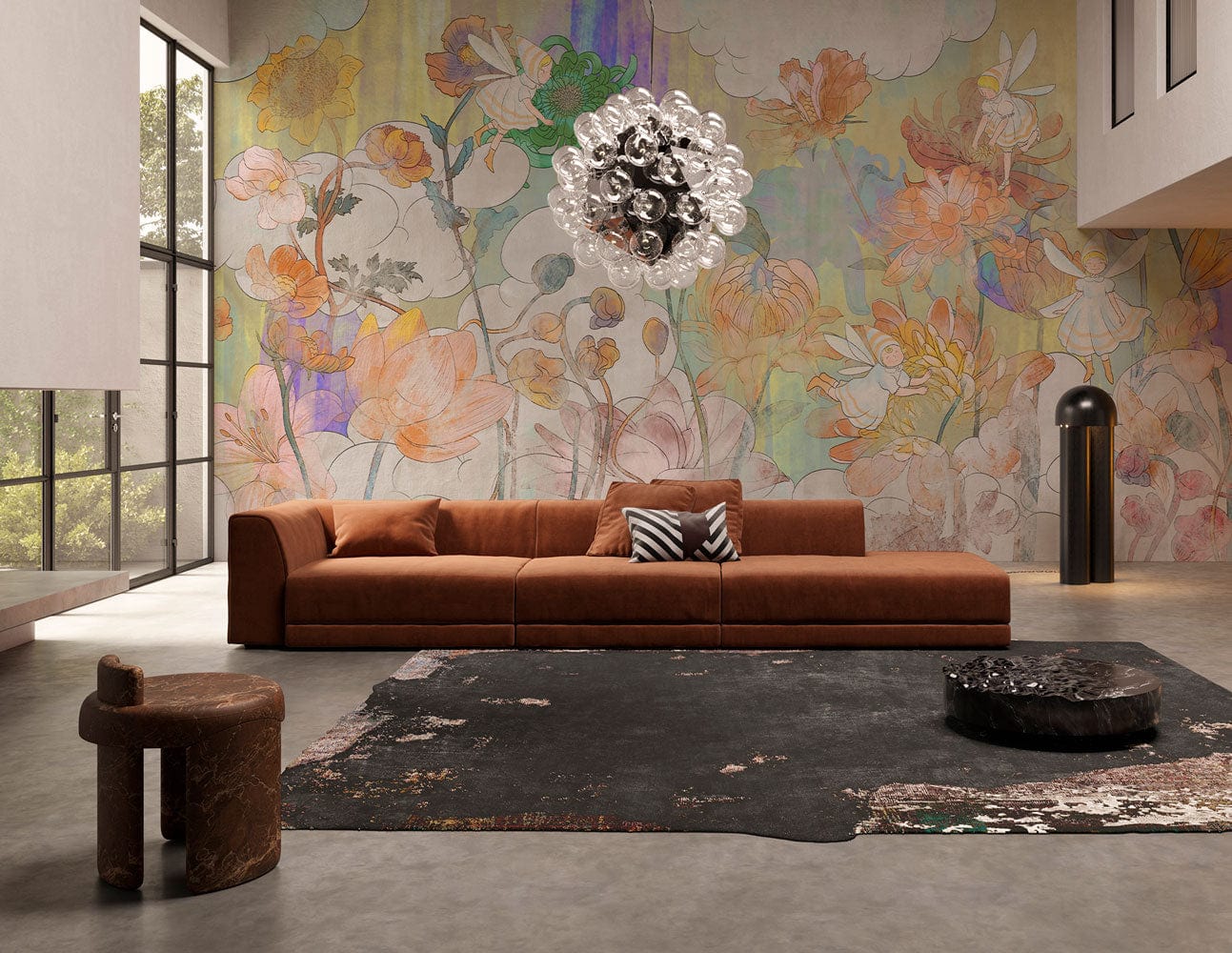 Immerse yourself in a whimsical realm with the Elves In Flowers Wallpaper Mural II. This enchanting design showcases delicate florals intertwined with playful elves, evoking a sense of wonder and fantasy. The mural's soft, flowing lines and detailed artistry invite a touch of magic into your space, making it a perfect backdrop for both serene and vibrant interiors.