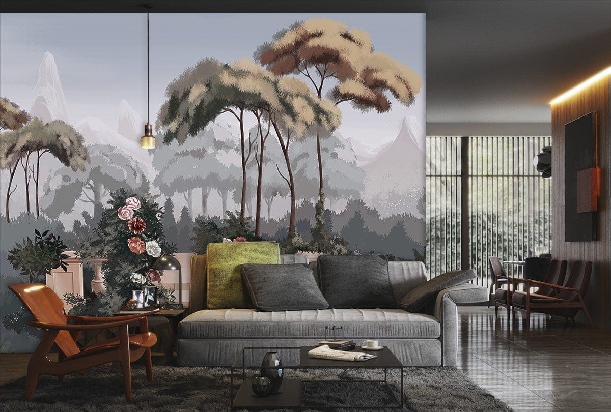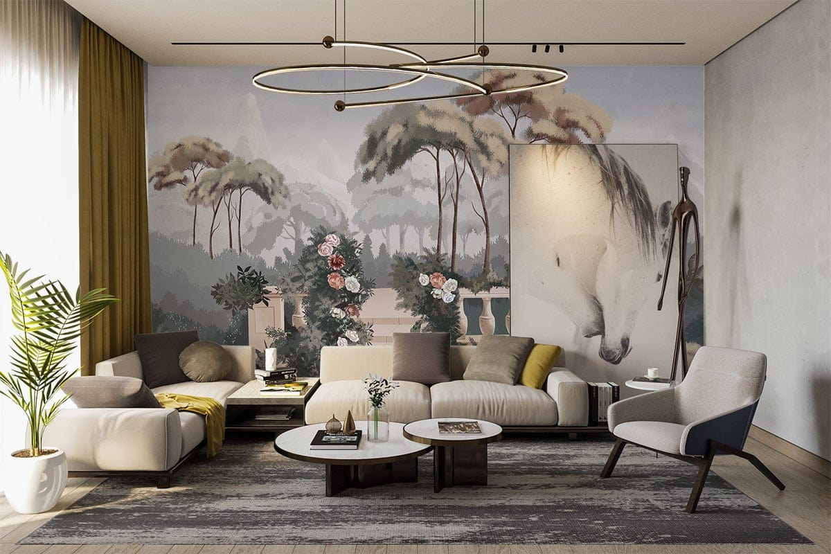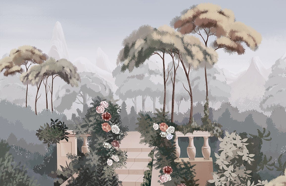 The Yard Wallpaper Mural offers a captivating depiction of a serene landscape, bringing the tranquillity of an elegant garden into your home. Delicate brushstrokes form graceful trees and lush foliage, with soft shades adding depth and dimension. This mural's sophisticated palette effectively balances soft pastels with rich earth tones, making it ideal for classic and contemporary interiors alike.