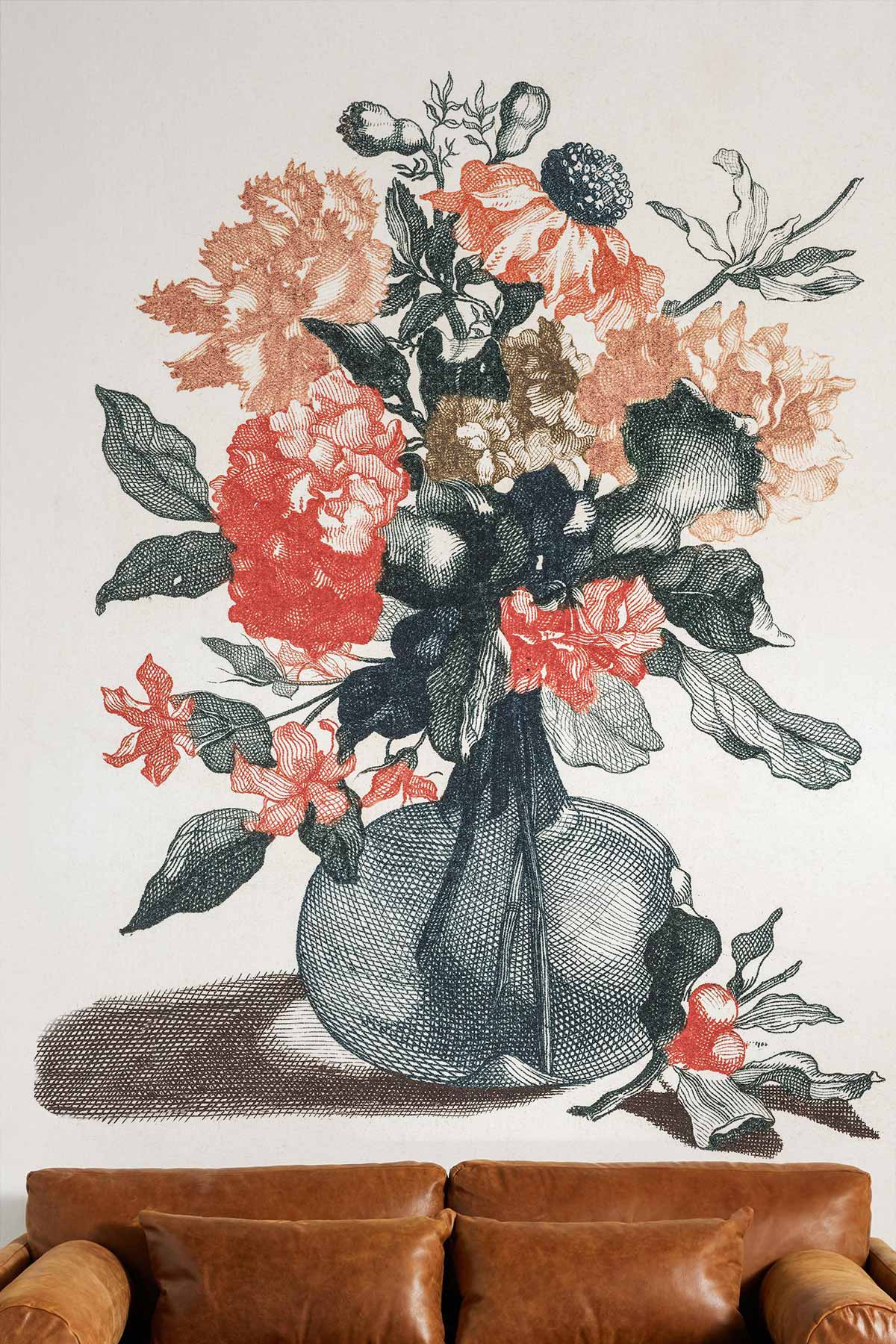 This exquisite wallpaper mural captures the timeless allure of a classic floral arrangement. Intricate bouquets of coral, soft peach, and deep green unfold on a gentle backdrop, creating a serene and sophisticated ambiance. Perfectly blending artistic detail with textural depth, it serves as an elegant centrepiece in diverse interior spaces, from traditional drawing rooms to contemporary living areas.