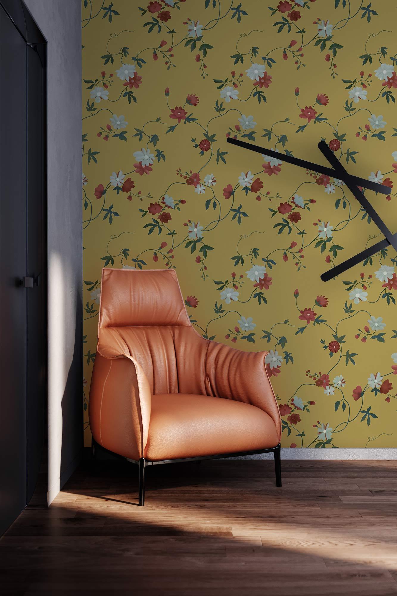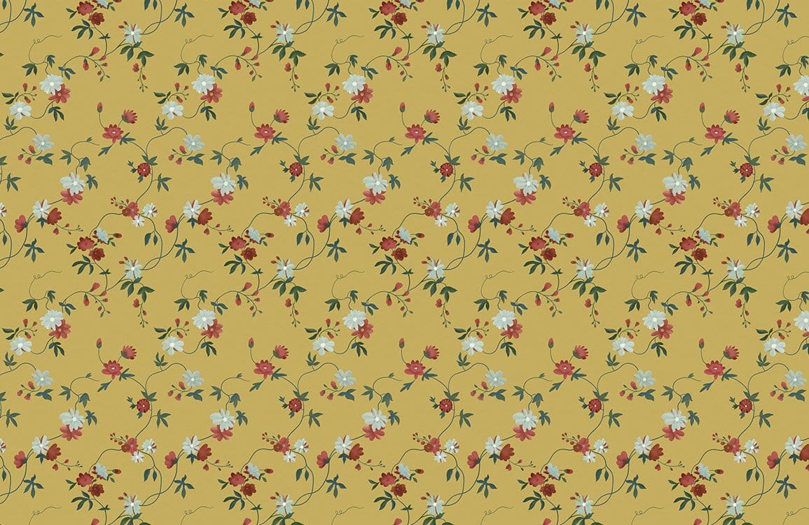 Beautify your home with this repeat small flower pattern wallpaper mural. This design in dark yellow background with flower vines crawling across your walls will instantly add more freshness to your rooms. Pair it with traditional furniture and home decors for a charming look to your Interiors.