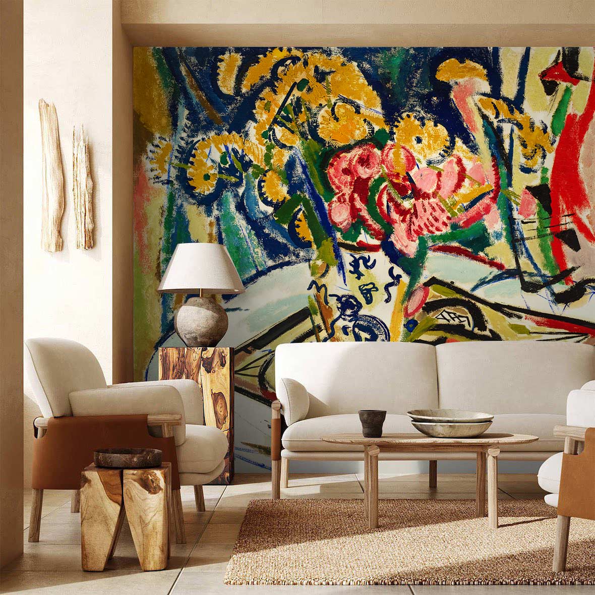 Immerse yourself in the captivating allure of the Flowers Wallpaper Mural, where striking floral motifs twist elegantly across a vibrant canvas. The intricate brushstrokes and dynamic composition evoke a lively sense of movement and depth, making it an exquisite focal point for any room. This mural seamlessly blends artistic sophistication with a timeless charm, promising to allure admirers in diverse settings.
