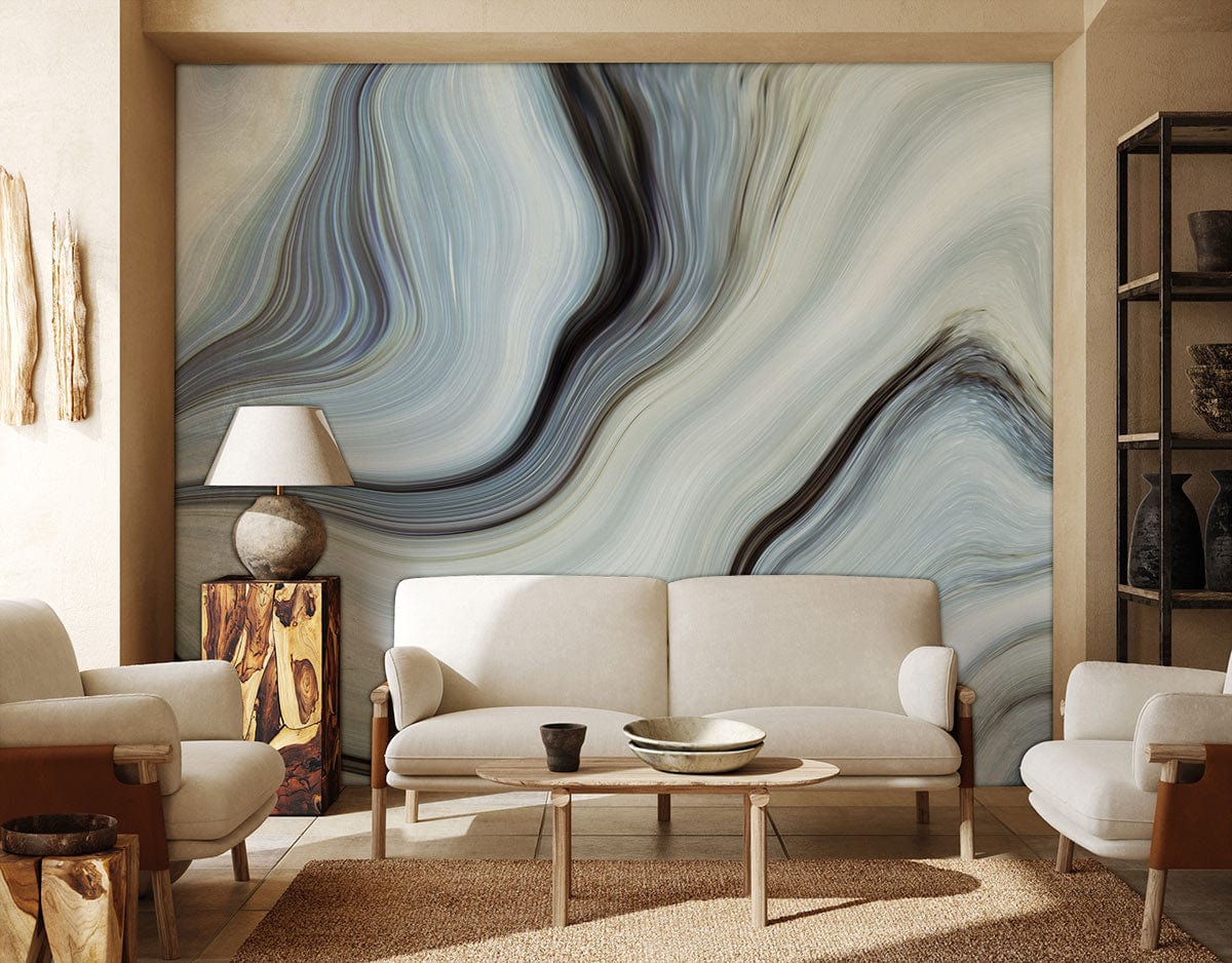 The Flowing Blue Marble Wallpaper Mural captures the organic beauty of nature with its intricate swirls and fluid patterns. Its soothing blues and subtle greys evoke a sense of calm sophistication, perfectly complementing both classic and contemporary interiors. This wall mural draws the eye and enriches any room with its artistic elegance and understated charm.