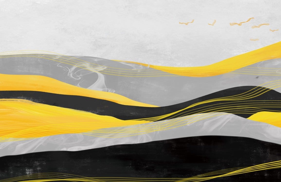 Immerse your interiors in the Fluid Wallpaper Mural's captivating wave-like design. Sweeping strokes of calming greys and bold yellows intertwine, bringing a sense of movement and depth to any space. This piece artfully balances modern aesthetics with timeless elegance, making it a sophisticated addition to varied décor themes.