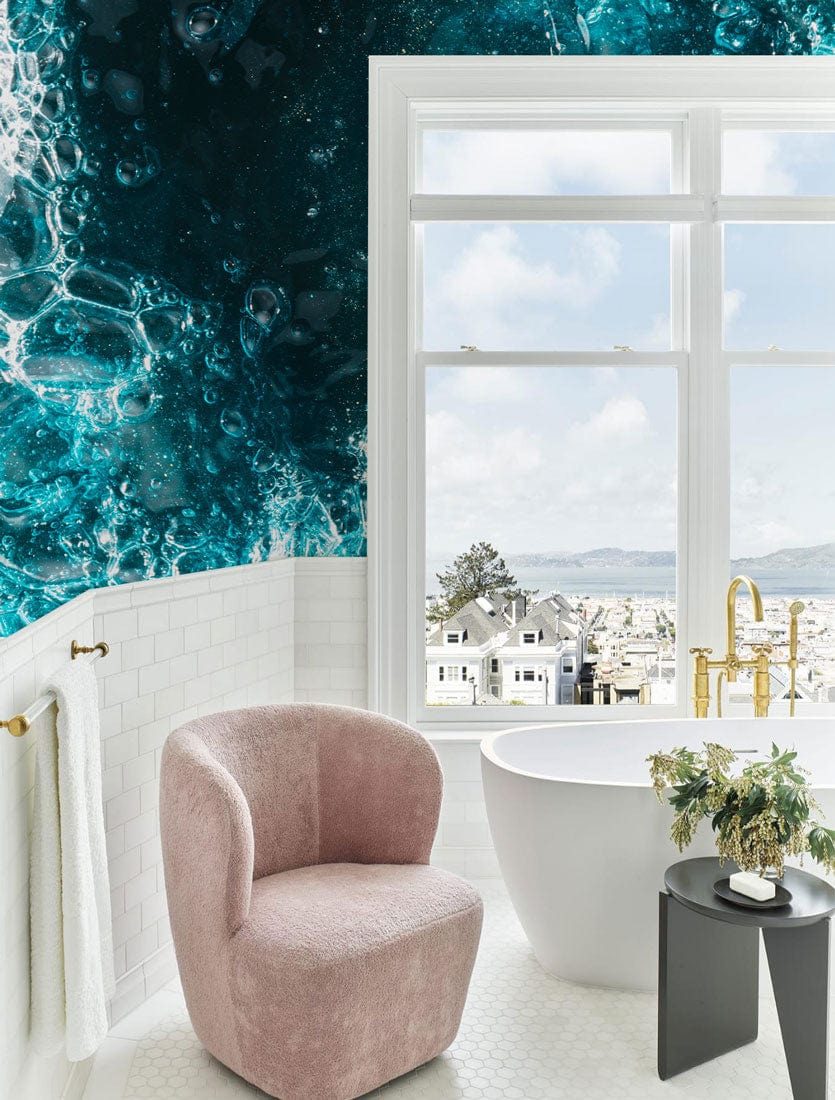 Dive into an ethereal seascape with the Fluorescent Ocean Hole Wallpaper Mural. Its intricate design captures the mesmerising dance of bubbling waves in vivid turquoise and deep sapphire, creating a stunning visual depth. The shimmering textures evoke a sense of tranquillity and elegance, perfect for those seeking a serene yet sophisticated ambiance in their interiors. This mural gracefully complements modern and coastal aesthetics, making it a versatile choice for a variety of spaces.