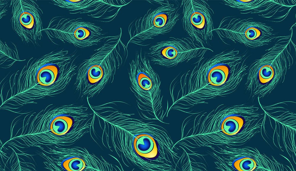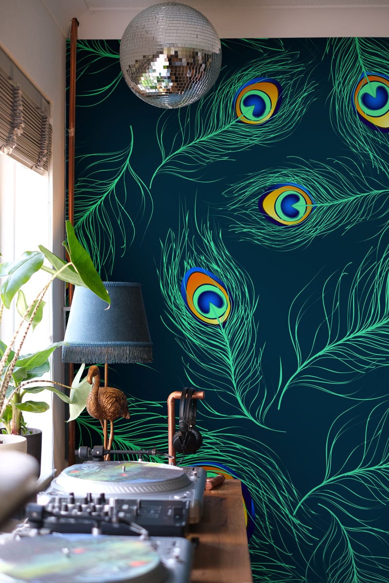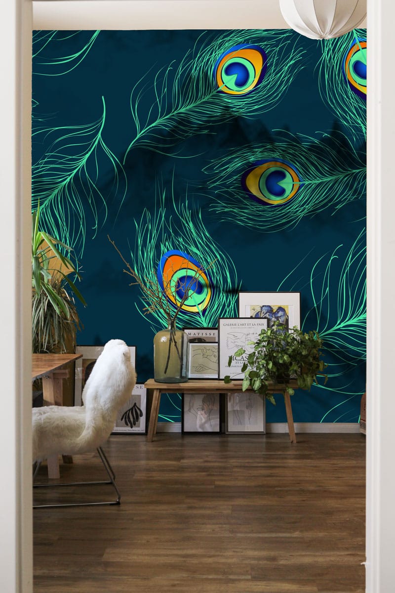 A captivating display of elegance, the Fluorescent Peacock Feather Wallpaper Mural features intricate feather motifs gracefully sprawled against a deep blue backdrop. Each feather showcases a vibrant spectrum, drawing the eye with vivid blues, greens, and hints of orange, capturing nature's artistry. This sophisticated design effortlessly complements various interior themes, creating an ambience of refined tranquillity.