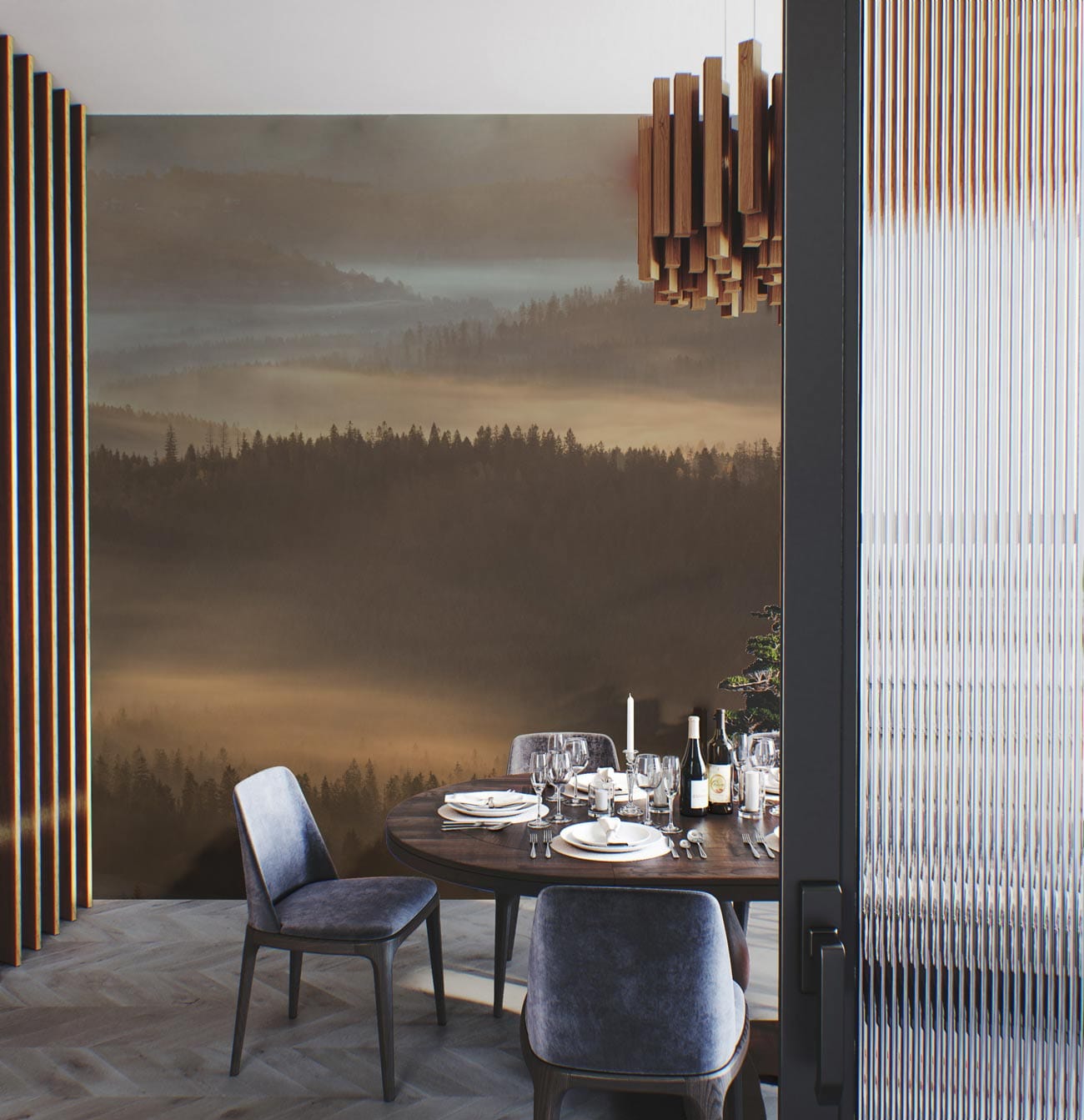 The Fog Surround Wallpaper Mural captures the serene beauty of a mist-covered landscape, featuring gently undulating hills and forests cloaked in soft, atmospheric fog. Its delicate shades of muted greens and subtle greys bring a tranquil ambience and refined elegance to any interior, making it a versatile choice for both contemporary and classic décors. This mural's intricate details and soothing textures create an inviting backdrop that fosters a sense of calm and sophistication.