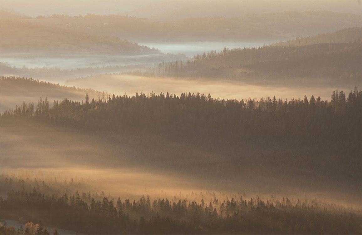 Customize a warm, tranquil space with our Fog Surround Wallpaper Mural. This mural features a misty dawn forest design, with the trees and distant mountains glowing in a hint of orange and brown against the pale grey sky. Perfect for living rooms, bedrooms, and other areas in your home or office where you want to add some art that stands out from the rest, this wallpaper mural brings the outside world into your home, adding colour and texture to any room.
