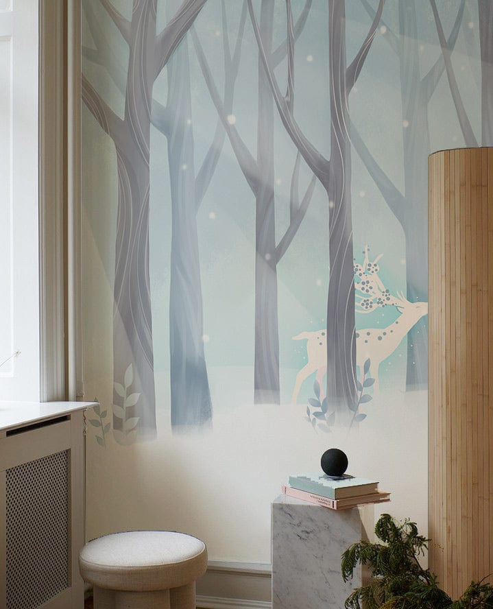 Our Foggy Forest Mural Wallpaper is inspired by the mystery of forests. This wallpaper is packed with forest motifs and has every tree branch, creepers, and foggy mist. Featuring a foggy forest scene in an exquisite Japanese style design, the presence of a single colour, clear, and lack of high contrast make it a good choice for living room or other places you want to relieve your tired eyes after a long working day. Ideal for a nursery or any room that needs some colour, our mural will have you dreaming of walks in the woods.