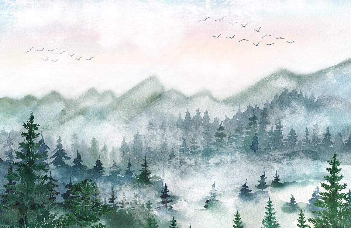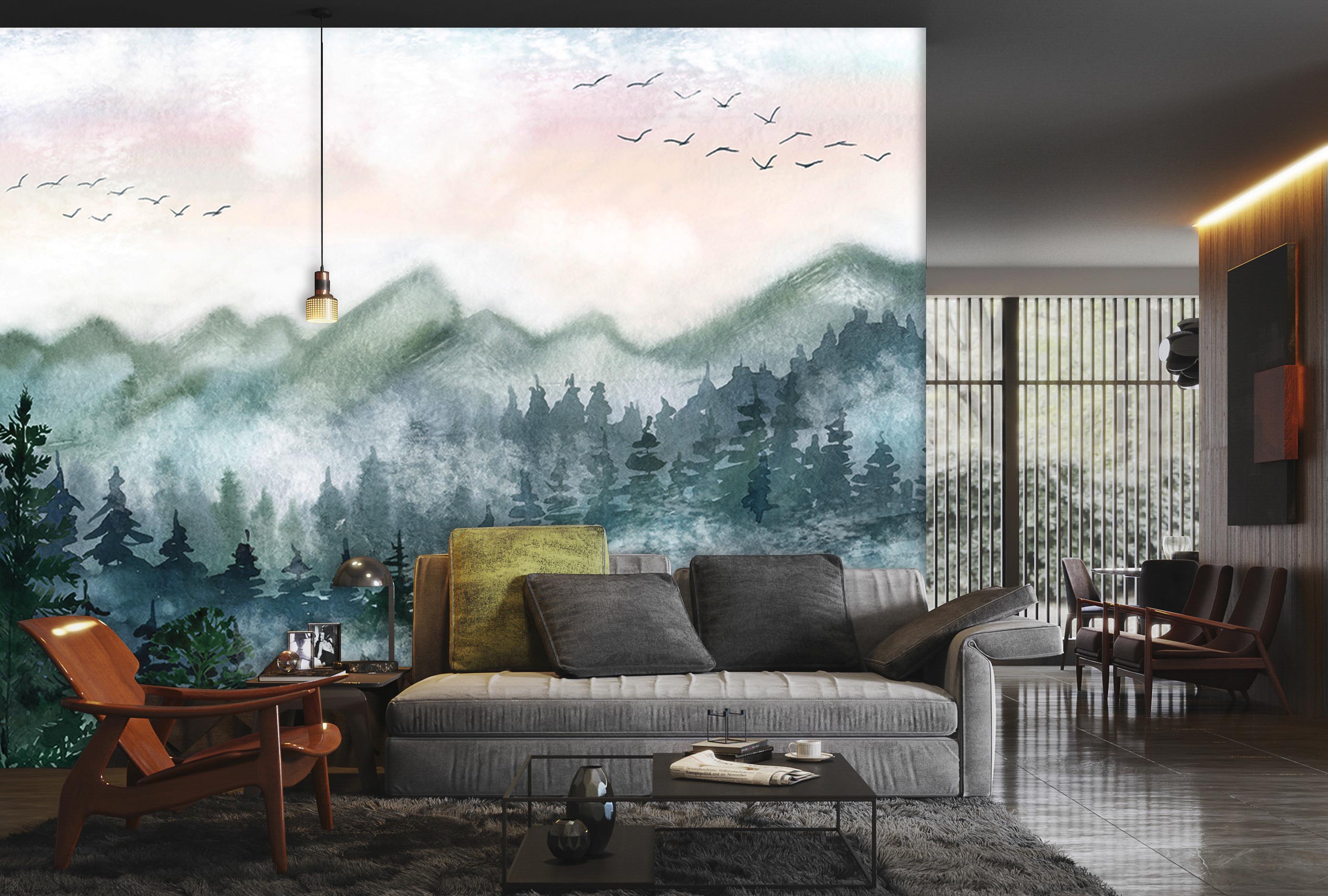 Immerse your space in the serene beauty of the Foggy Pine Valley Wallpaper Mural. This exquisite design features a misty landscape of verdant pines and distant mountains, conjuring a sense of tranquillity and natural elegance. The subtle movement of birds across the soft horizon adds a captivating, ethereal quality, making it perfect for creating an inviting ambience in any room.