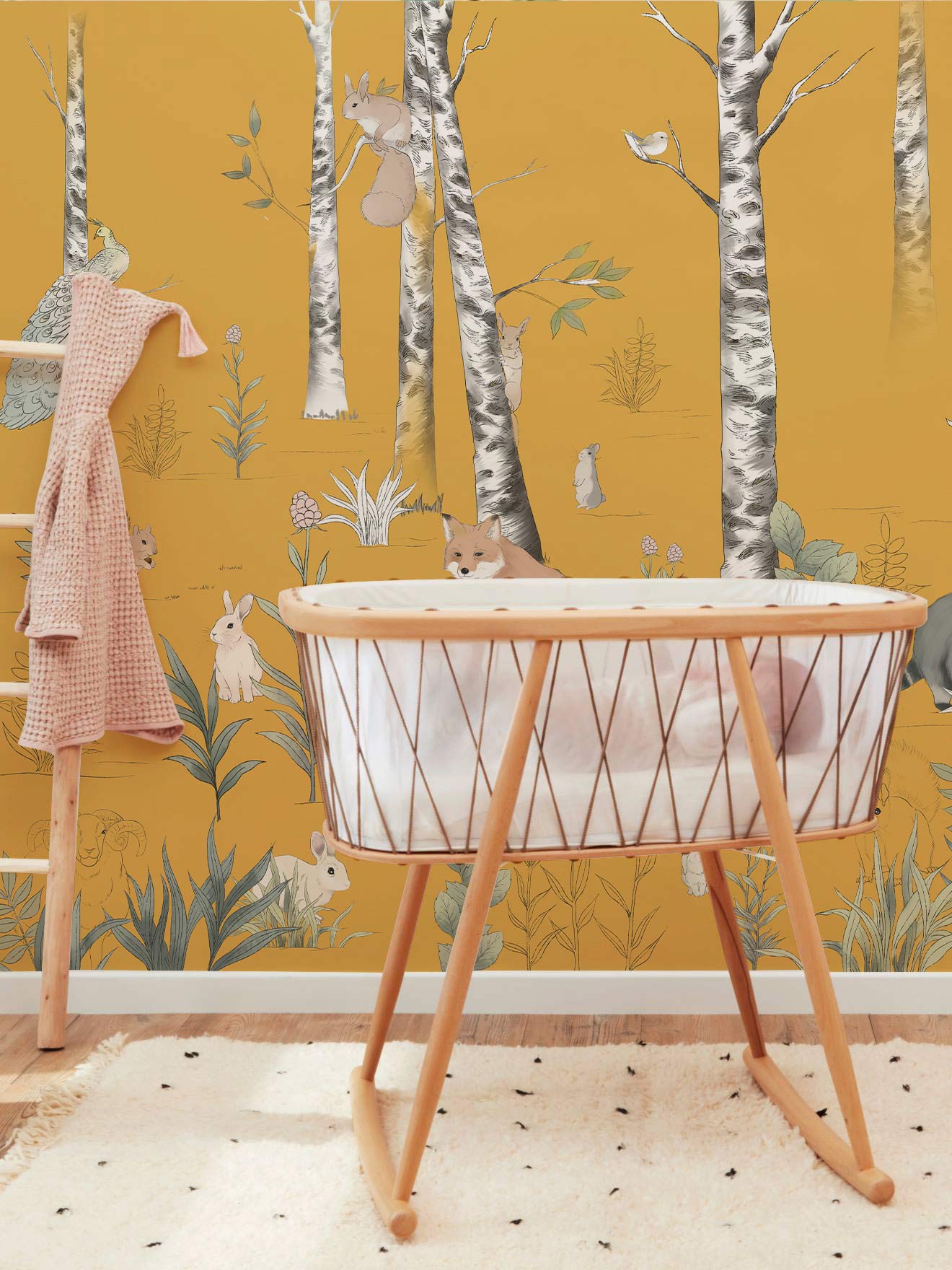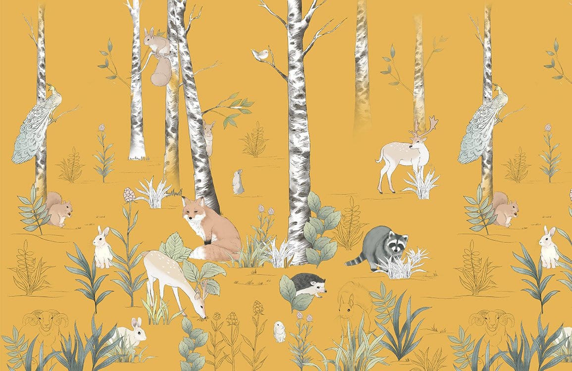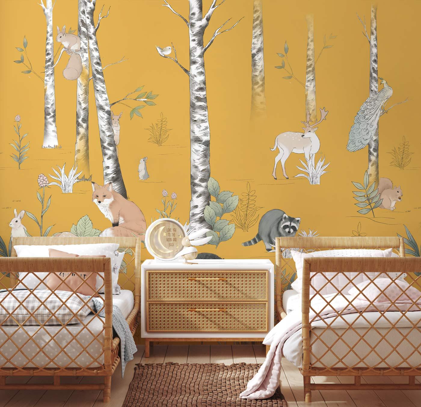 Immerse your space in the tranquil charm of a woodland haven with this exquisite Forest Animals Wallpaper Mural. The design intricately weaves together gentle forest creatures and delicate foliage, set against a rich golden backdrop. The depiction of birch trees and the lively woodland fauna adds a sophisticated touch, making it a refined choice for diverse interiors ranging from cosy living rooms to serene offices.