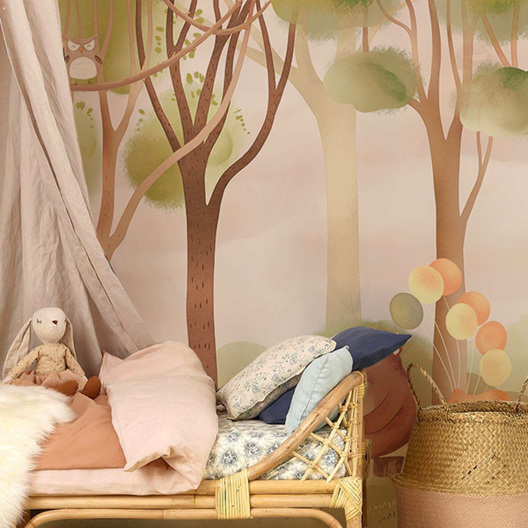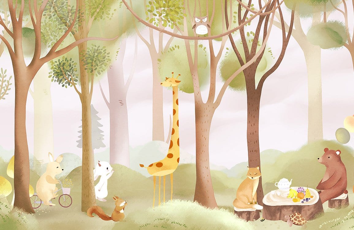 If you are looking for a cute forest wallpaper mural for your kid's room, here is a great one for you. This beautiful painting of animals having a wonderful picnic in the peaceful green forest designed in soft pastal tones will be perfect for your child's bedroom and playroom. Interesting rendering with a natural atmosphere and a refreshing wall decoration perfect for your kids.