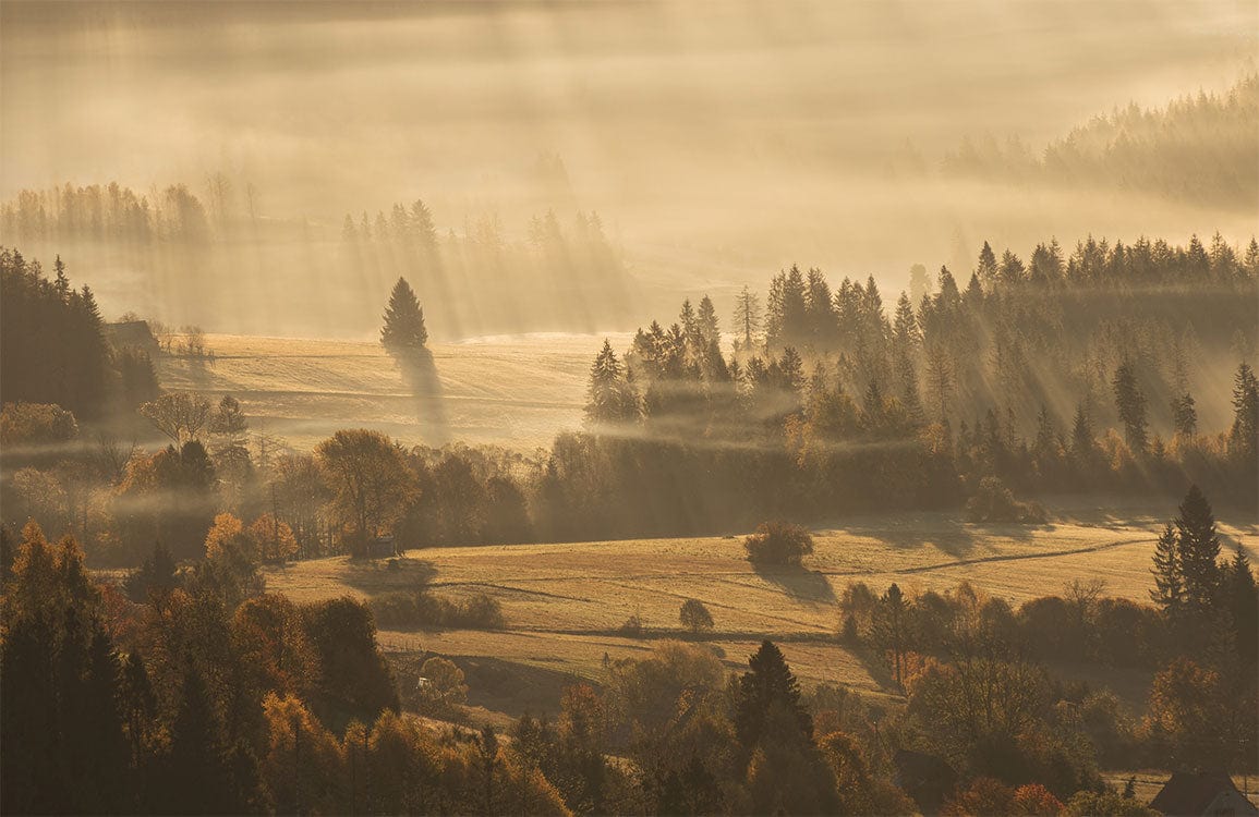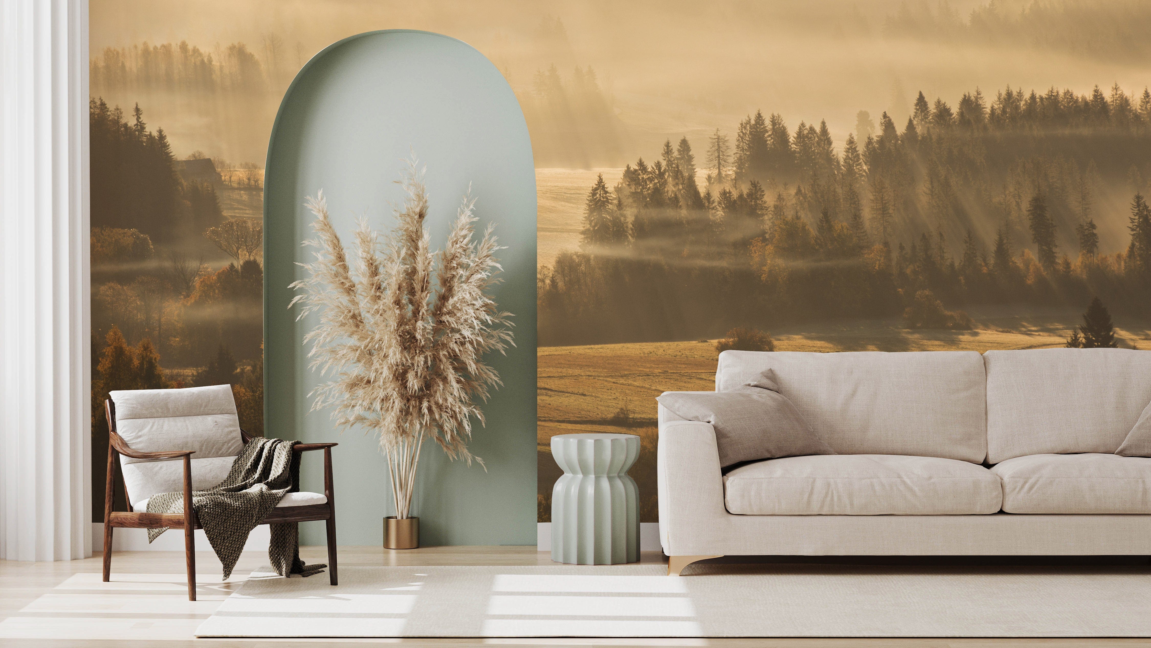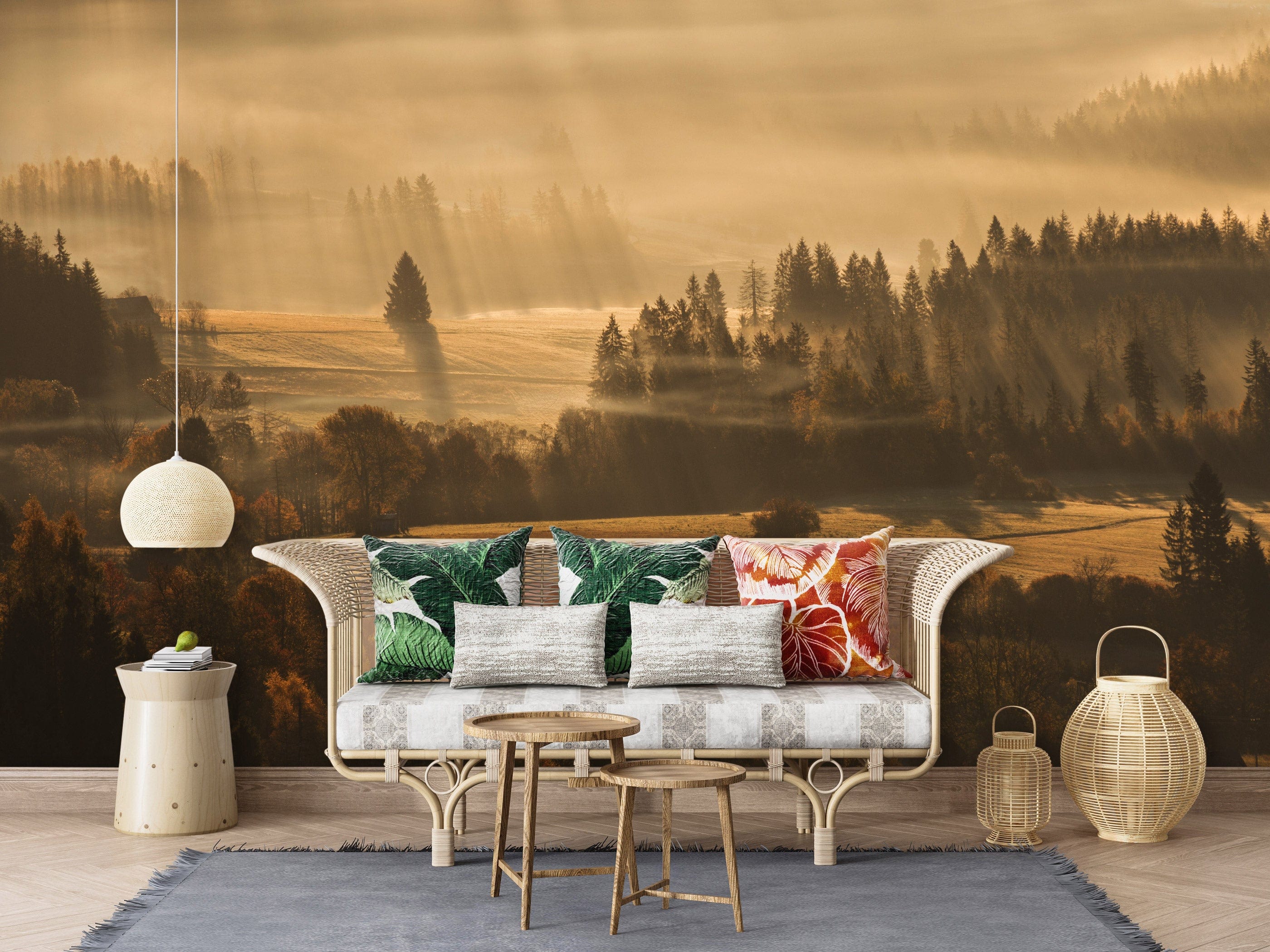 Immerse your space in the serene beauty of the Forest Farm Wallpaper Mural. This exquisite landscape captures a sweeping view of misty fields and towering trees bathed in golden light. The mural's intricate details and soft textures evoke a sense of calm and wonder, making it a distinguished choice for various interiors.