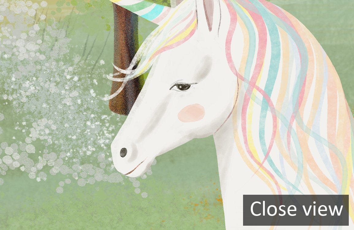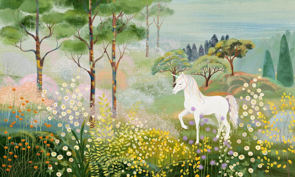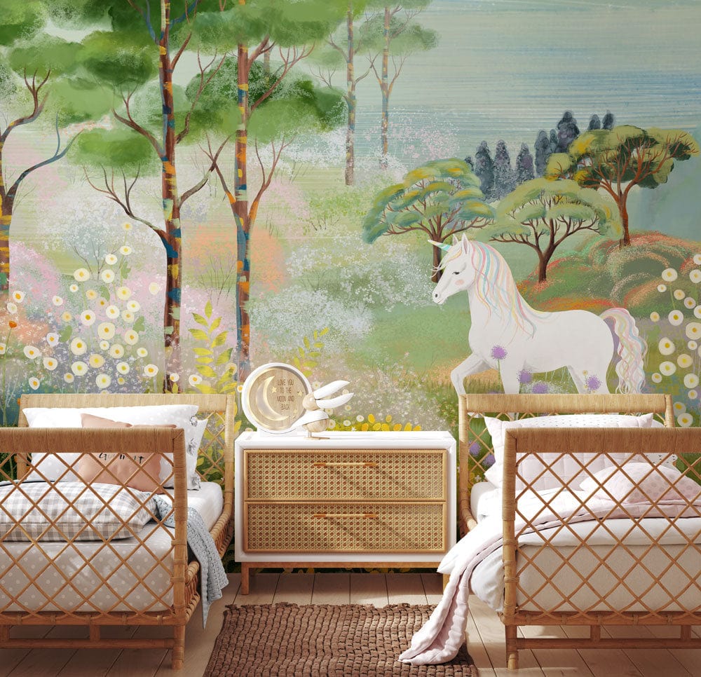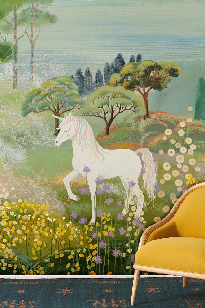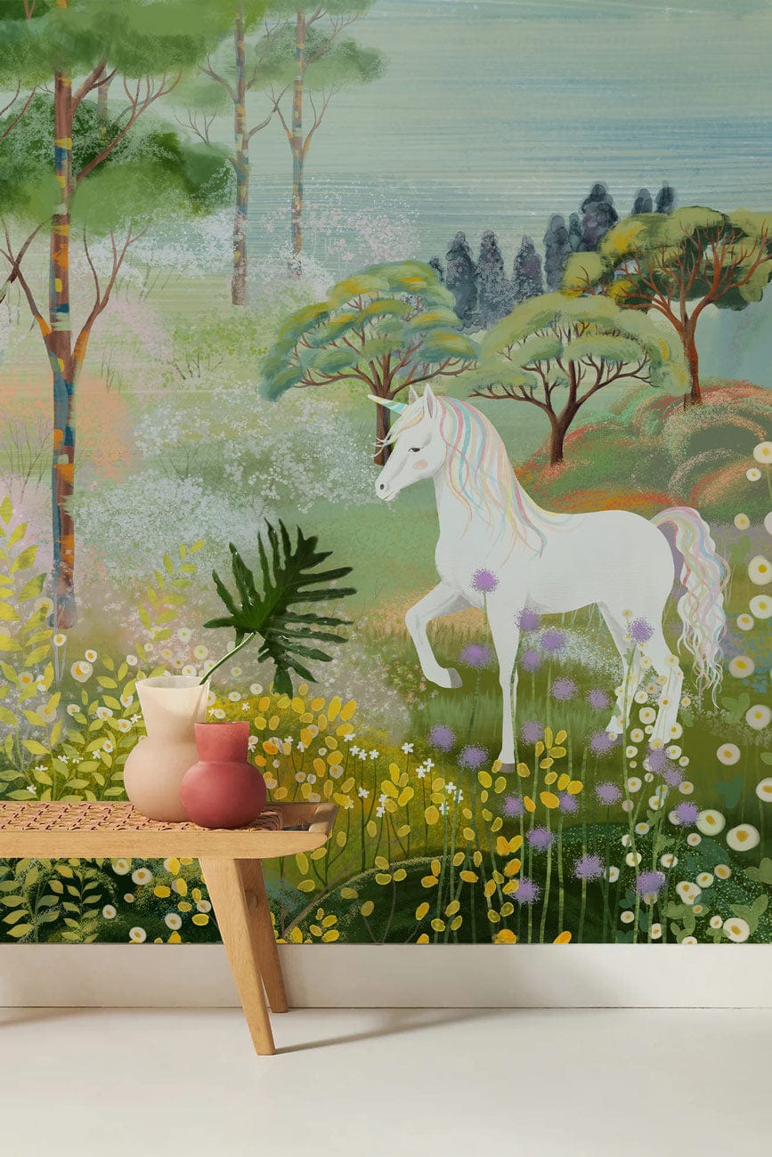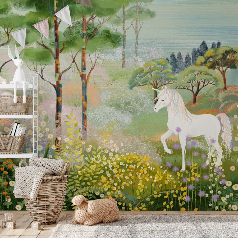 Immerse yourself in the enchanting realm of the Forest Flowers Wallpaper Mural, where a delicate unicorn gracefully roams a blossoming meadow amidst verdant trees and soft, rolling mist. The detailed artistry captures both whimsy and serenity, blending intricate floral elements and the mystical allure of a hidden forest. Its timeless elegance pairs beautifully with a variety of interior settings, inviting a sense of tranquillity and refined charm into any space.