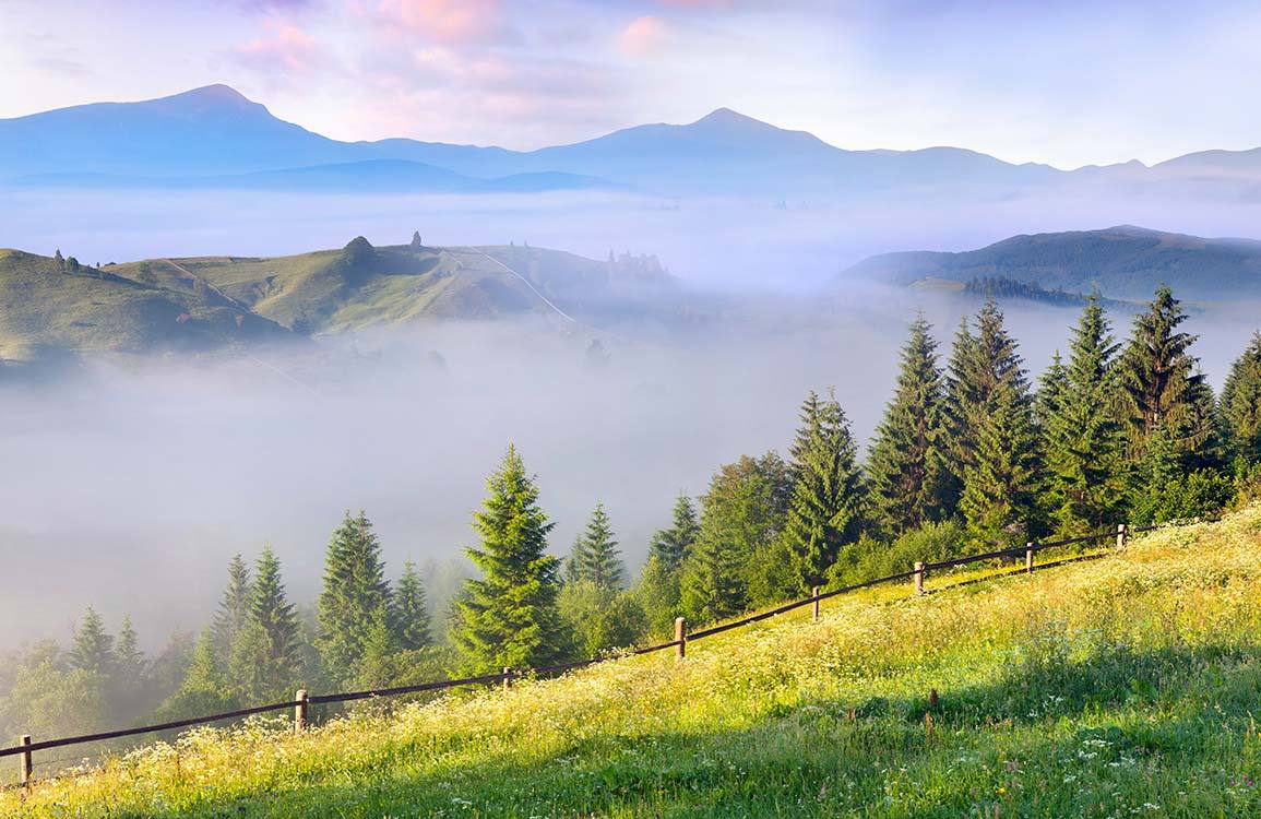 Add a gorgeous foggy forest and mountain mountain scene to your interiors and watch your bedroom, living room dining space or working space turn into a green peaceful and comfortable place. Experience pure positive energy as your eyes get fixated on the scenic landscape. This green mountain wallpaper mural will also perfectly match your furniture and any other home decorations.