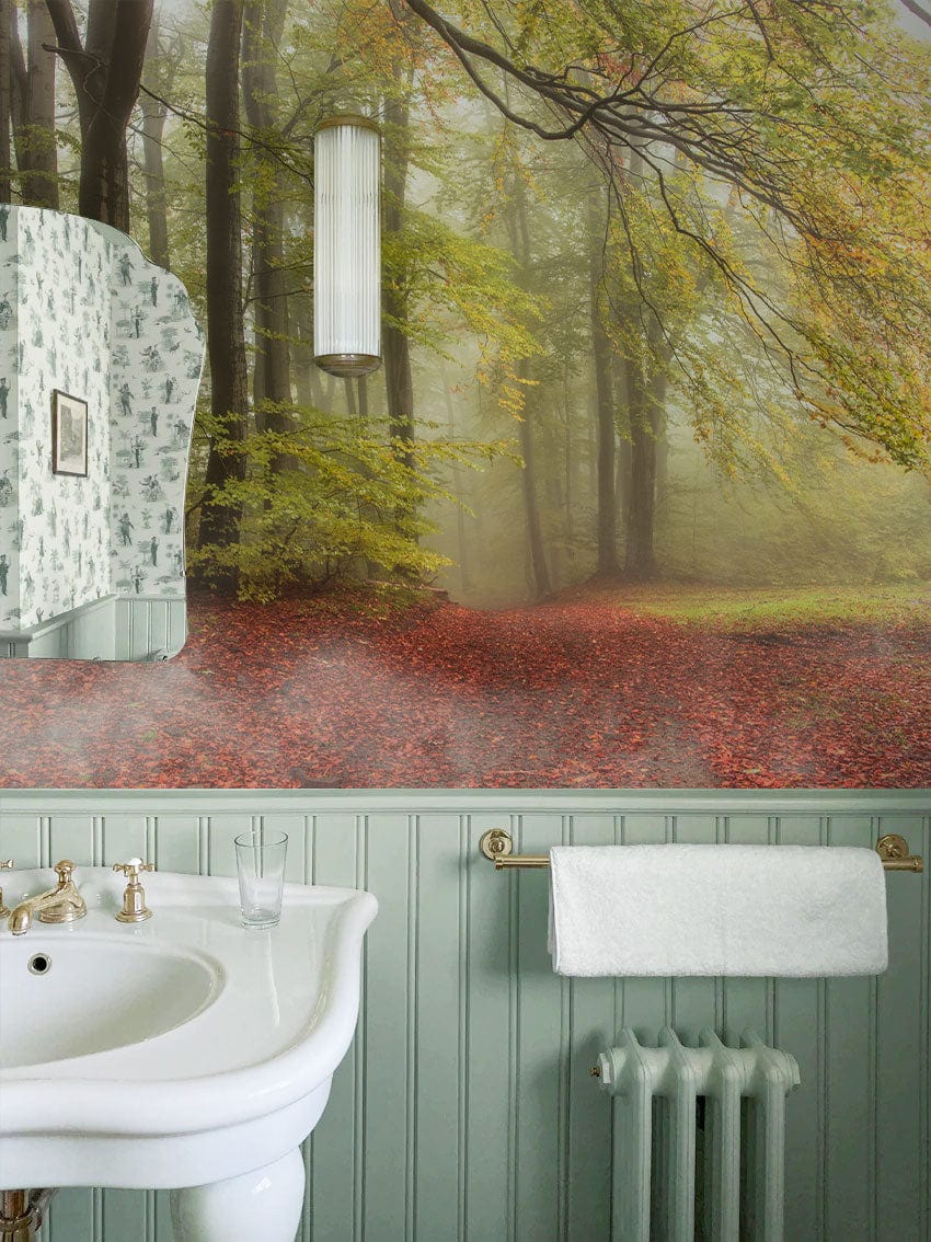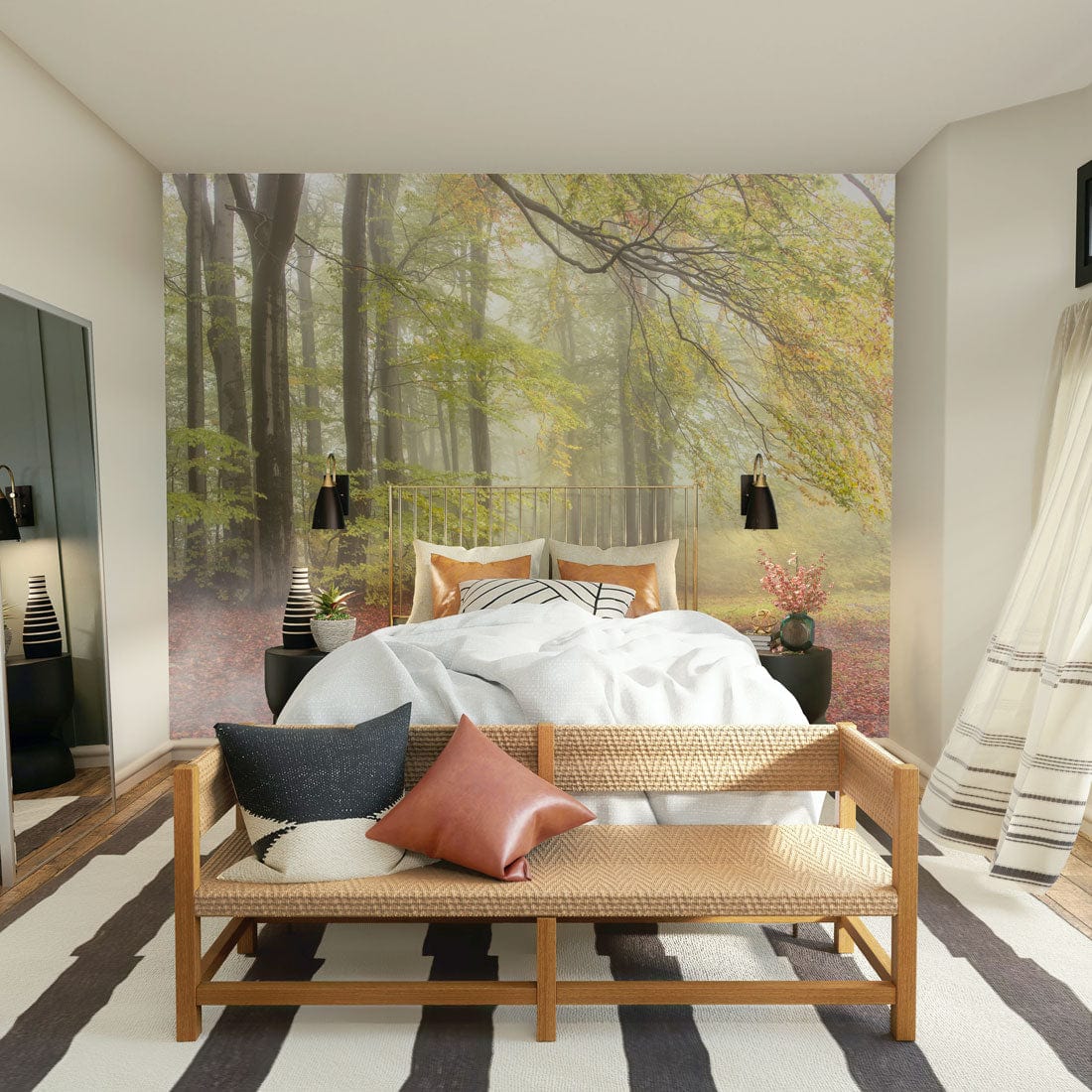 Immerse your living space in the serene beauty of nature with the Forest in Fall Wallpaper Mural. Its detailed depiction of towering trees, veiled in mist and framed by a carpet of vibrant autumn leaves, establishes a tranquil yet sophisticated atmosphere. This mural captures the ethereal transition of seasons, perfectly suited to elevate both modern and classic interiors with its captivating ambience.
