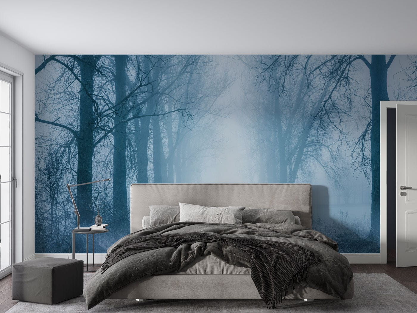Immerse your space in the mystique of an ethereal woodland with the Forest in Fog Wallpaper Mural. This captivating design showcases towering, silhouetted trees emerging through a delicate mist, creating an intriguing depth and atmosphere. Perfectly capturing the enchanting tranquillity of a foggy forest morning, this mural imbues interiors with a serene and sophisticated ambiance, making it an ideal focal point for diverse decor styles.