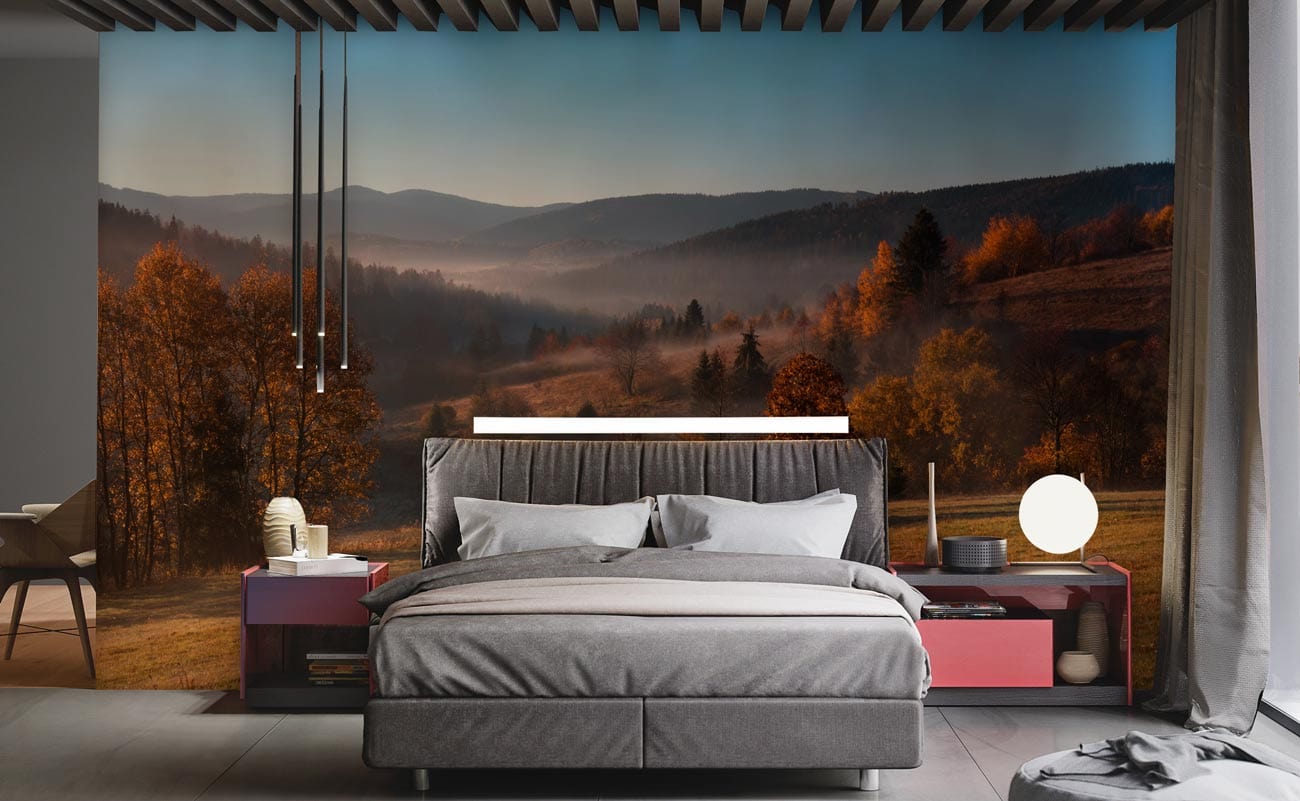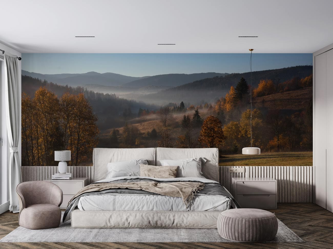 Immerse yourself in the serene beauty of nature with the Forest Lawn Wallpaper Mural. This exquisite mural features a mist-kissed landscape, where lush golden-tinged trees and rolling hills invite tranquillity into your space. Its captivating design captures the subtle play of light and shadow, evoking a sense of depth and peacefulness that resonates with timeless elegance. The rich textures and nuanced details create an ambience that welcomes introspection and reverie, making it a sophisticated addition to any interior setting.