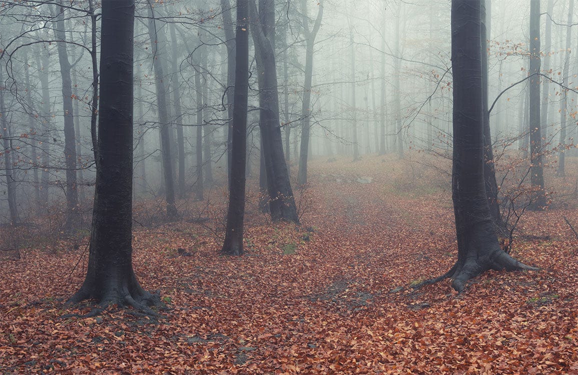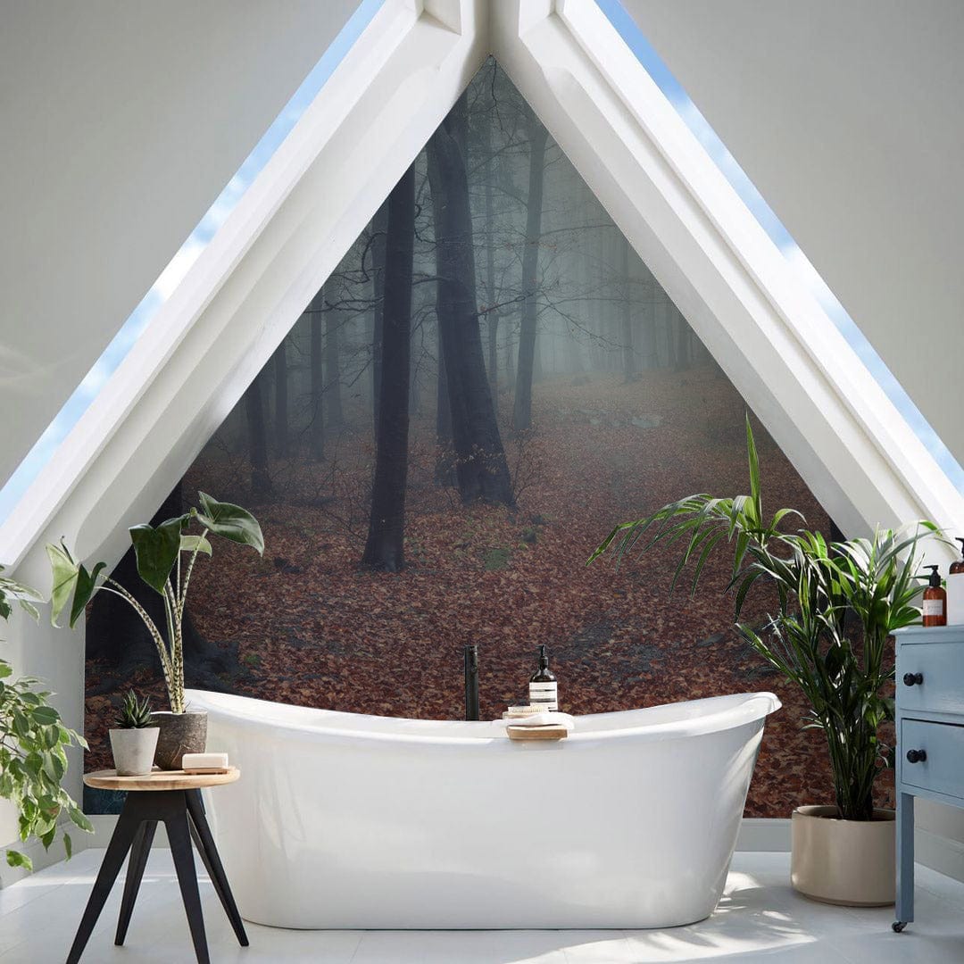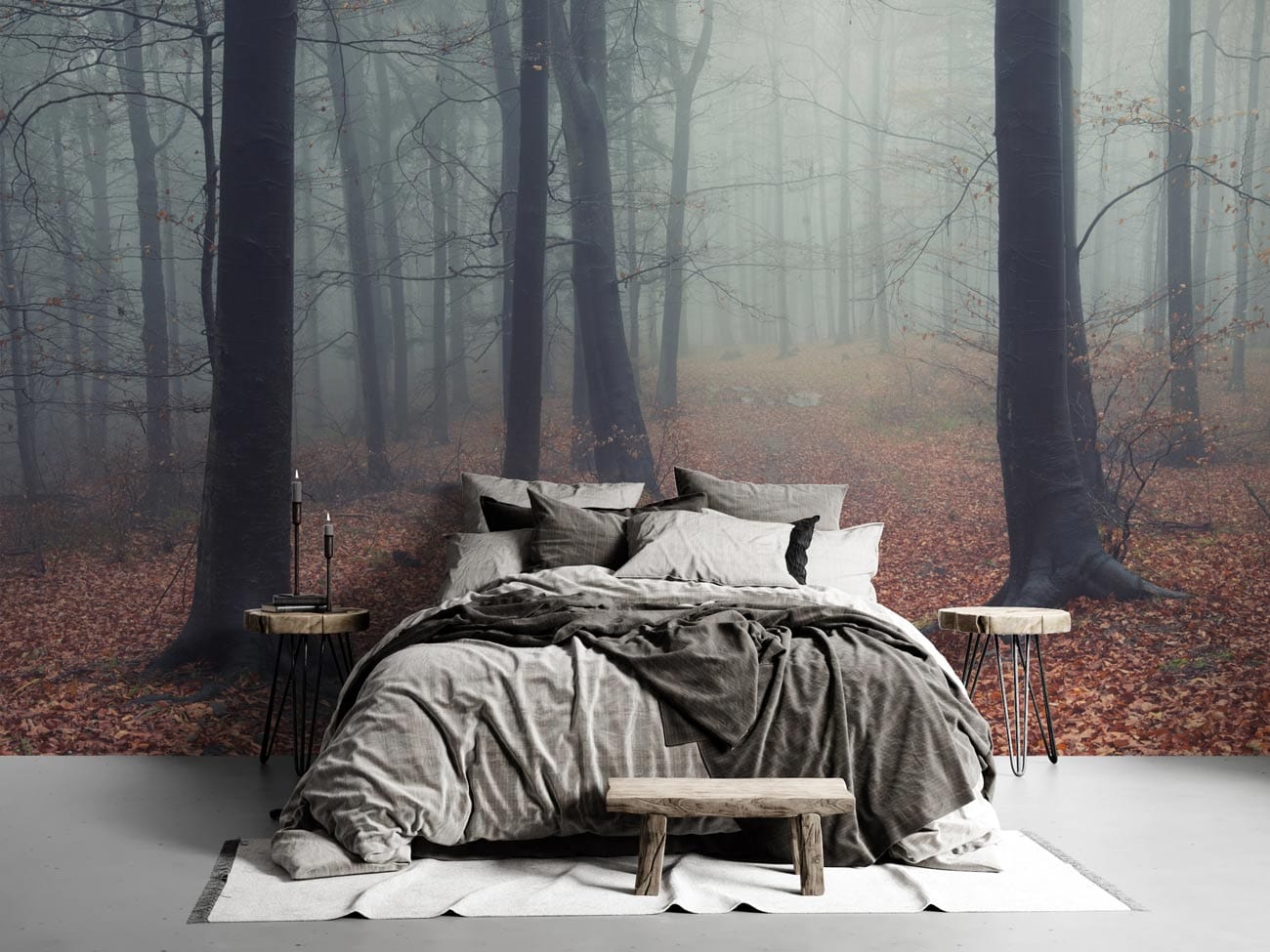 Immerse your space in the serene allure of the Forest Leaves Wallpaper Mural, where misty tree trunks emerge from a copper-hued forest floor, evoking a timeless woodland retreat. Delicate details and muted tones bring an understated elegance, making it an ideal choice for both contemporary and classic interiors.