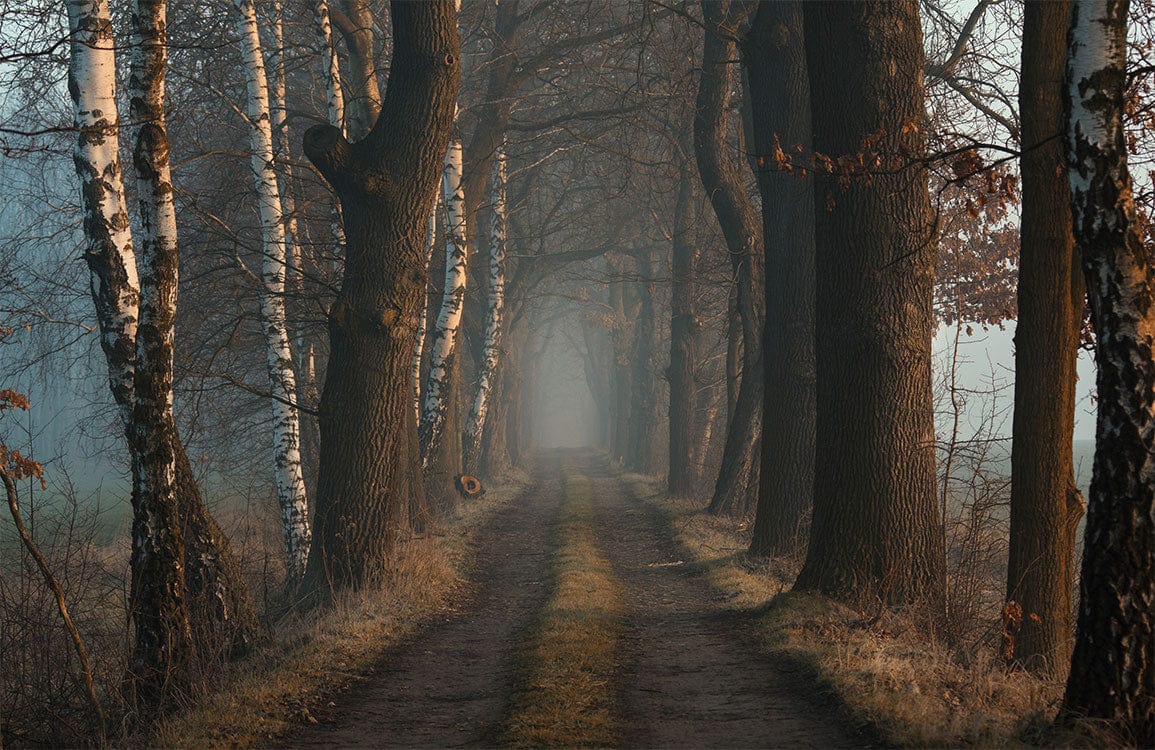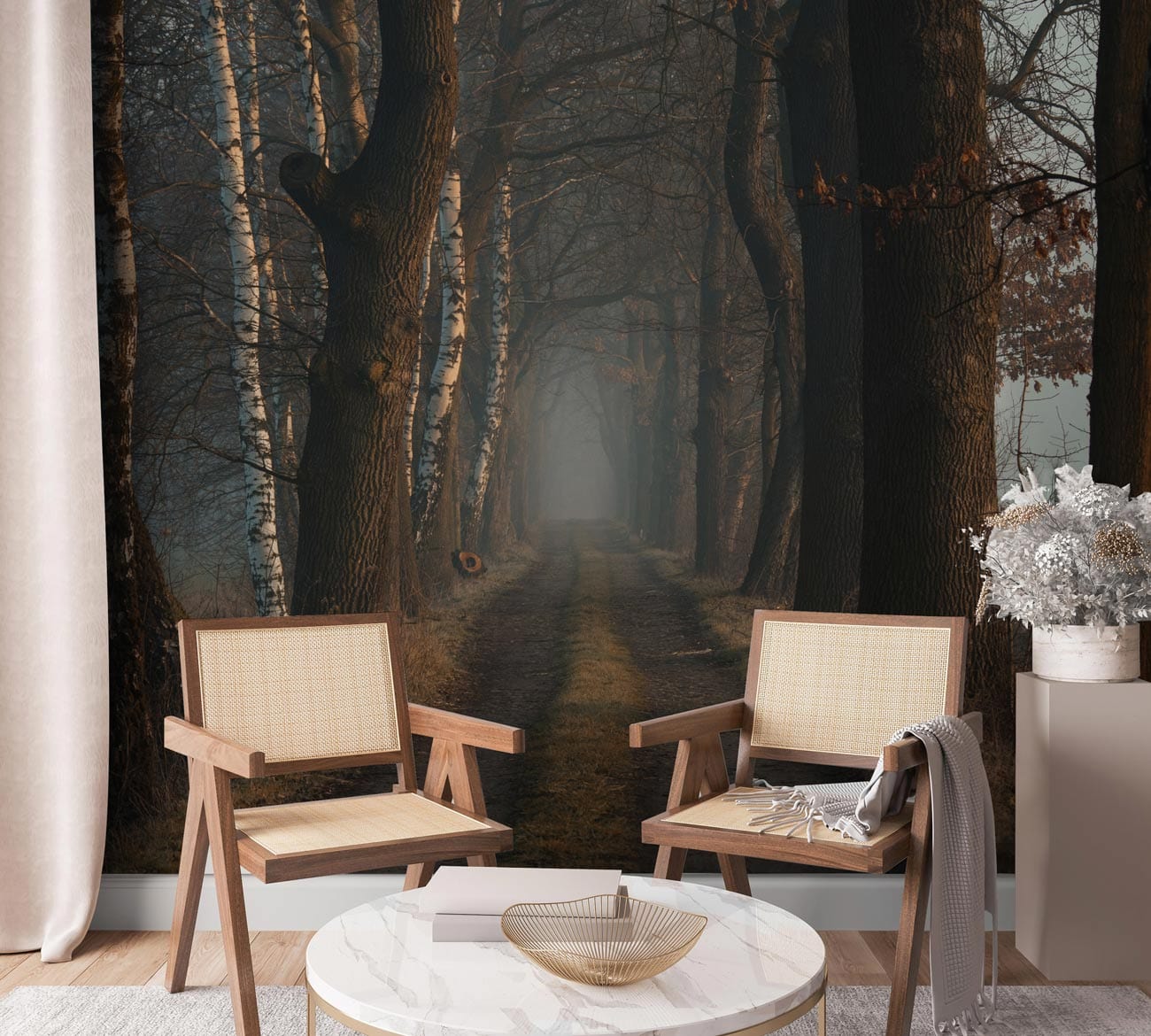 Immerse yourself in the serene allure of the Forest Path Wallpaper Mural, where a mist-shrouded trail winds through majestic trees, inviting tranquility and depth into any room. The intricate depiction of towering trunks and softly diffused light creates a captivating balance of nature's grandeur and subtle elegance. Perfectly tailored for interiors seeking a touch of timeless enchantment, this mural seamlessly integrates into both classic and contemporary settings, offering a sophisticated backdrop that complements and elevates the ambience.